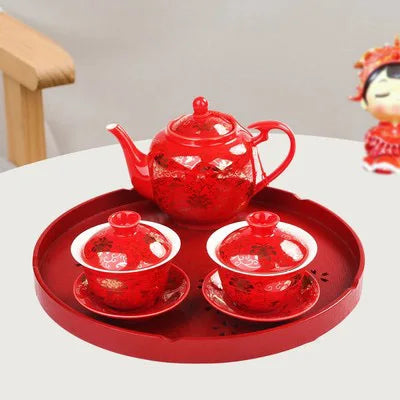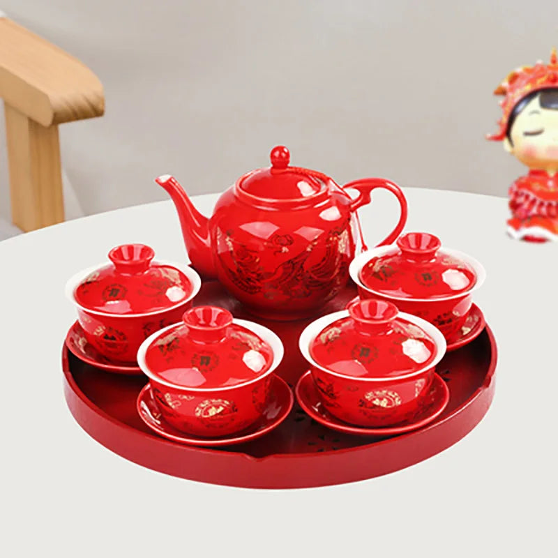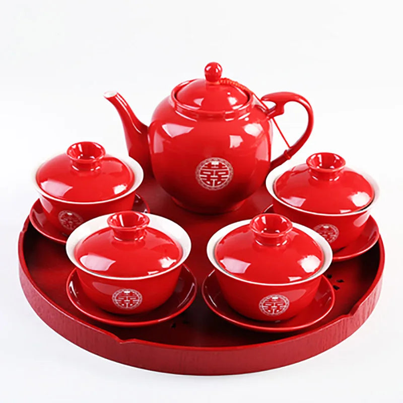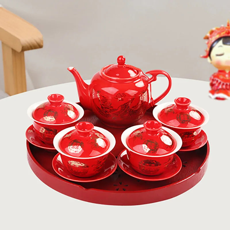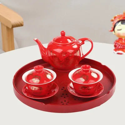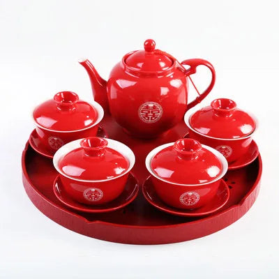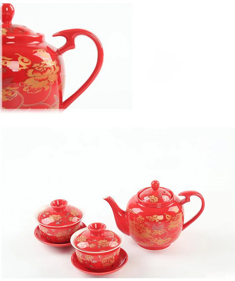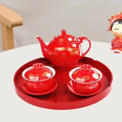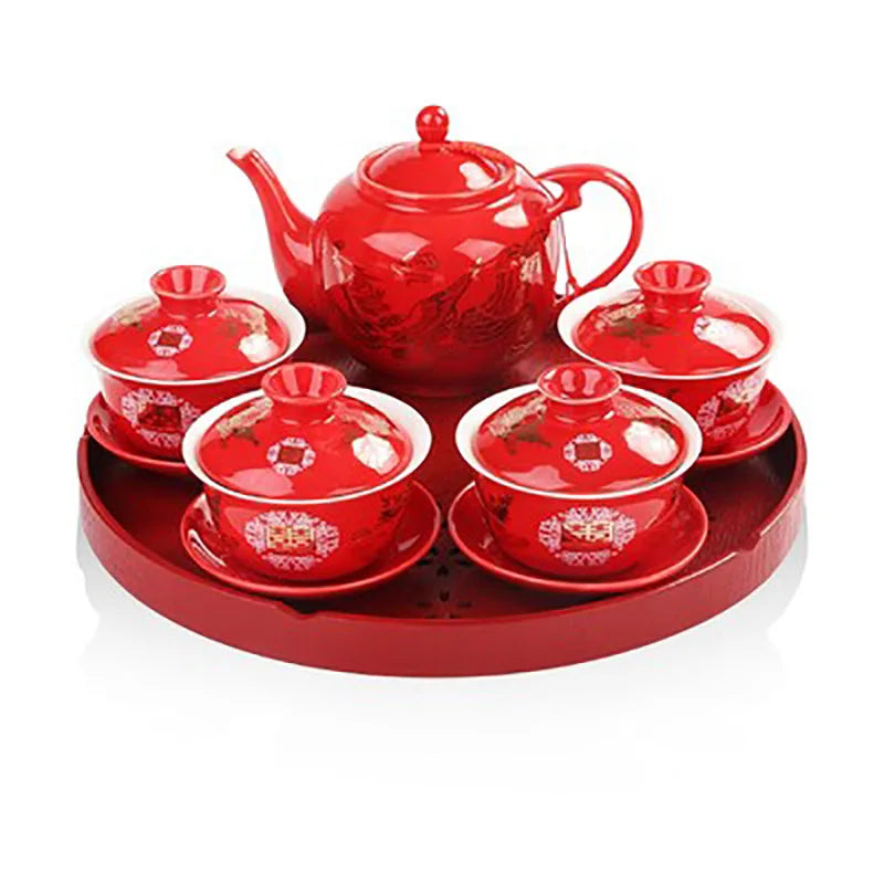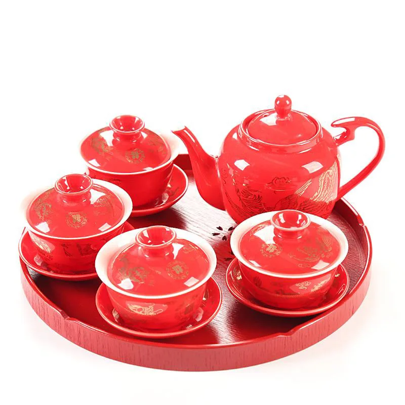 Chinese Wedding Supplies Red Ceramic Tea Set Tea infuser Pot Kettle Teapots Gaiwan Ceremony with Serving Tea Tray Souvenir Gift