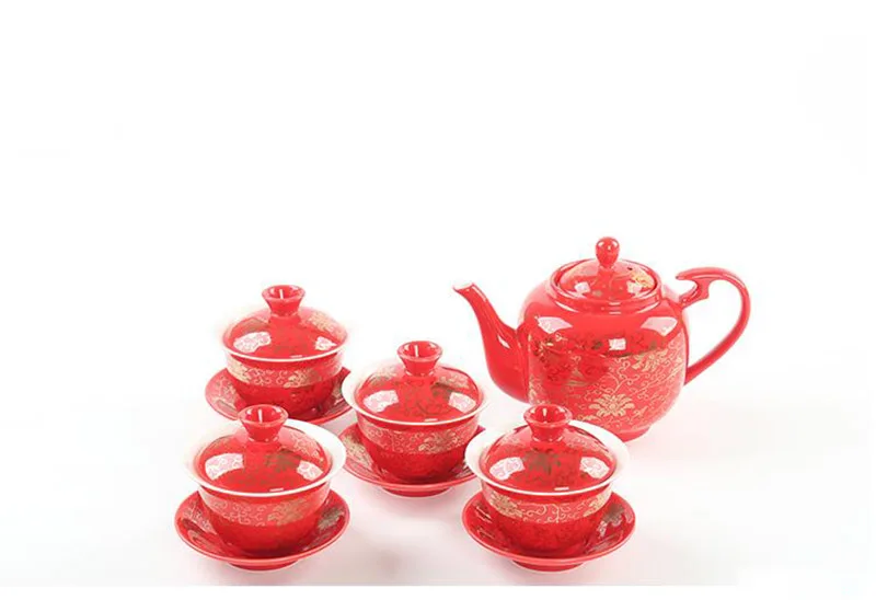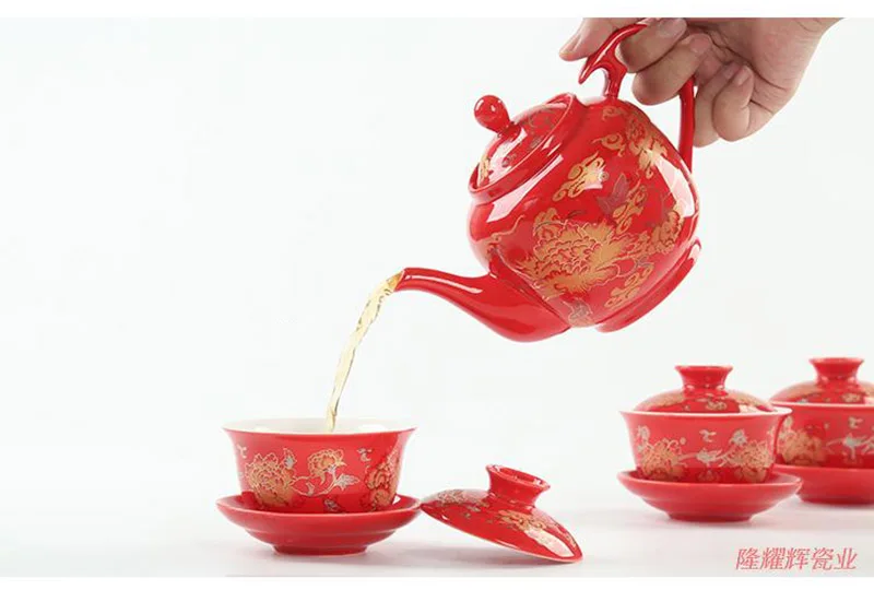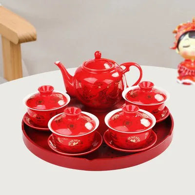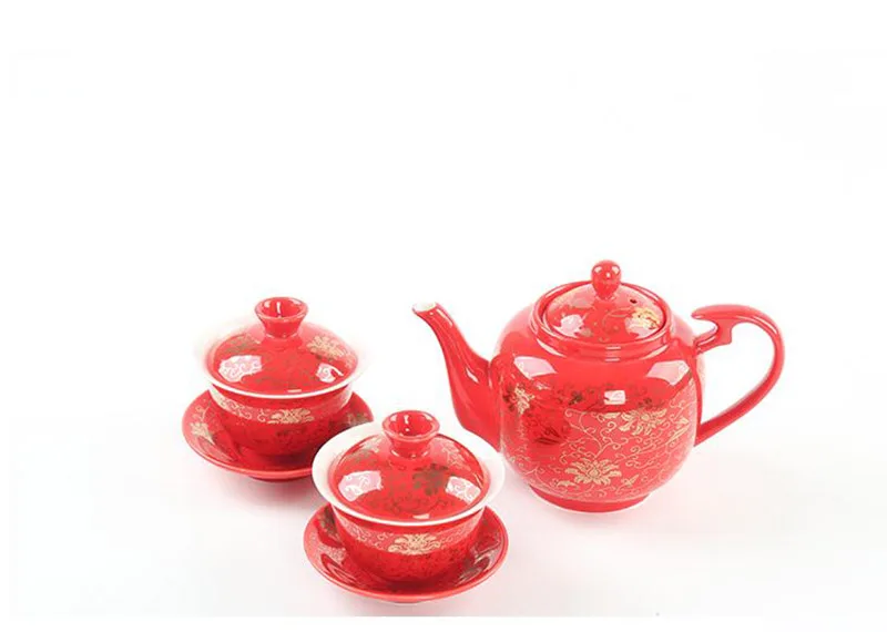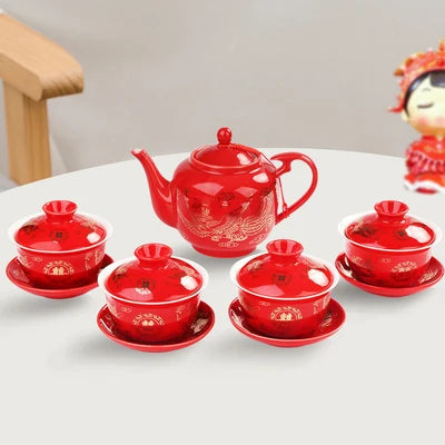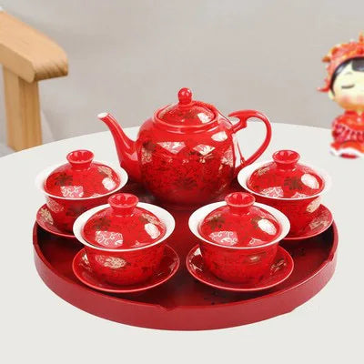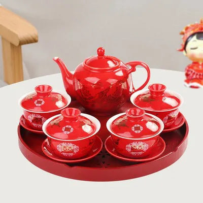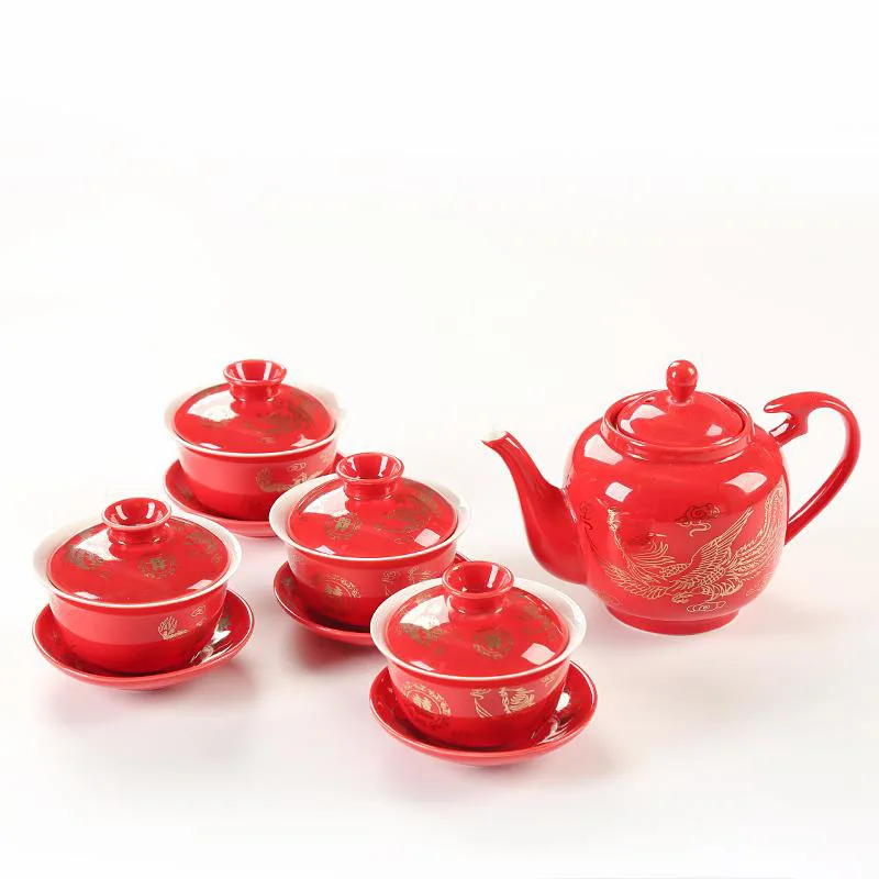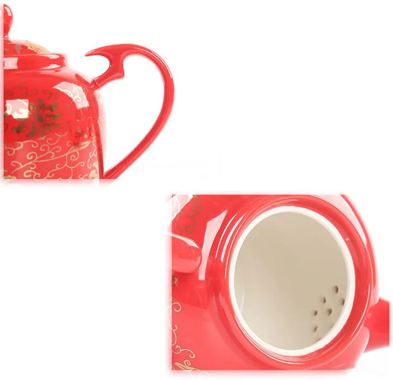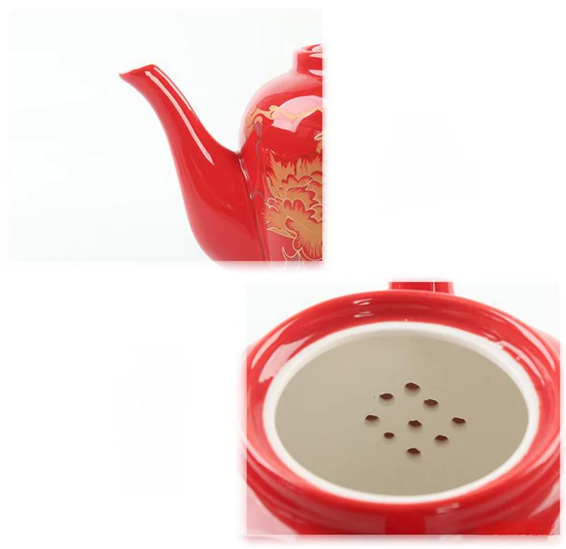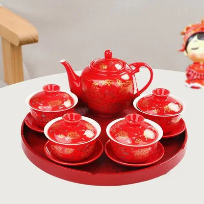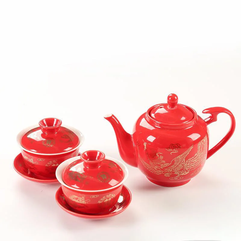 Chinese Wedding Supplies Red Ceramic Tea Set Tea infuser Pot Kettle Teapots Gaiwan Ceremony with Serving Tea Tray Souvenir Gift