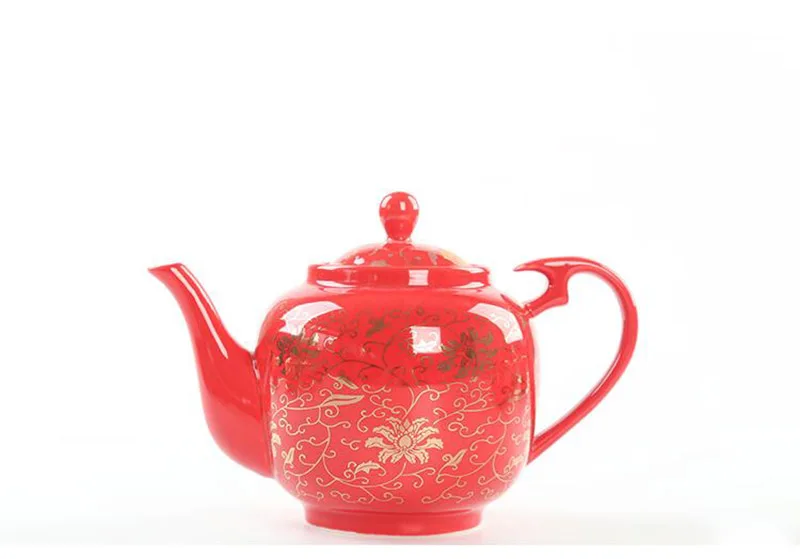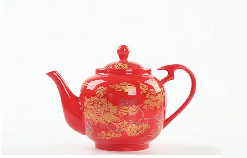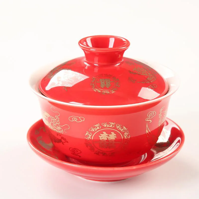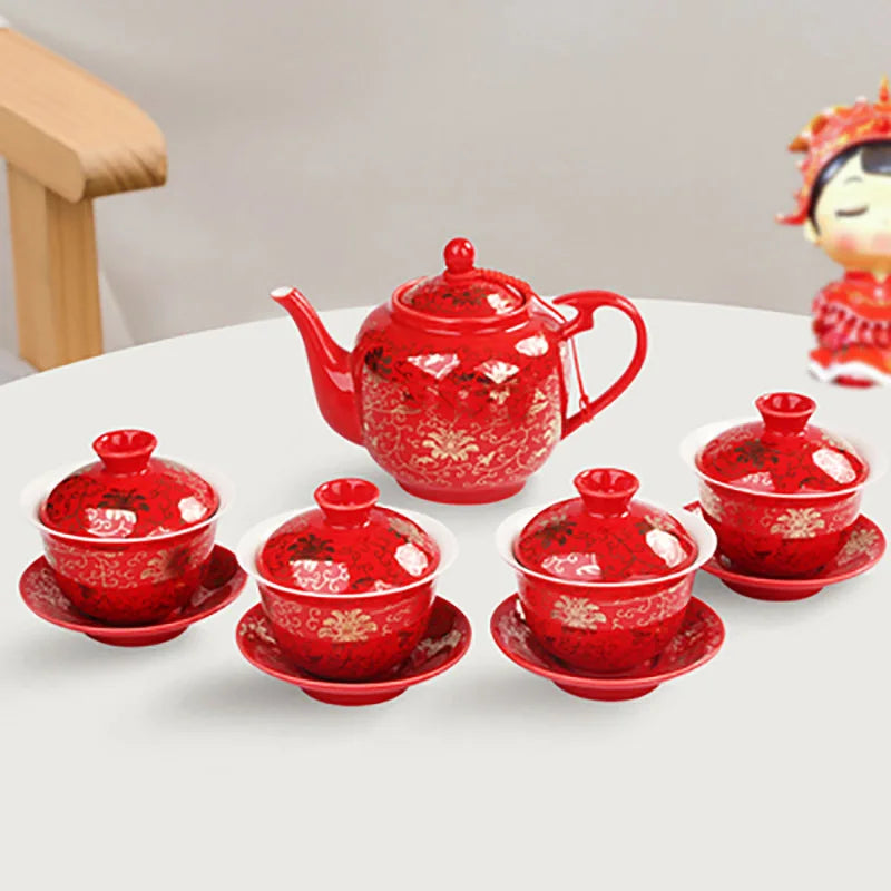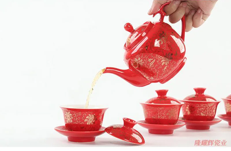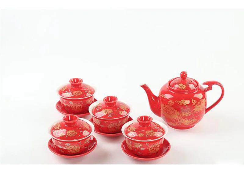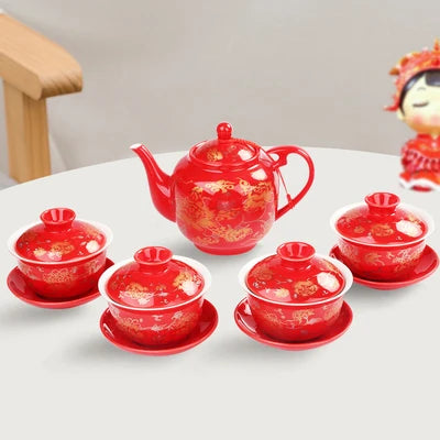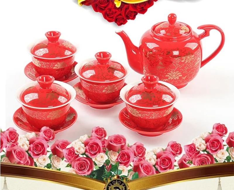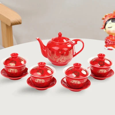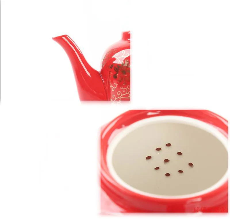 Chinese Wedding Supplies Red Ceramic Tea Set Tea infuser Pot Kettle Teapots Gaiwan Ceremony with Serving Tea Tray Souvenir Gift