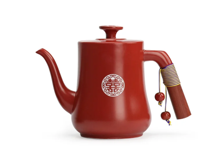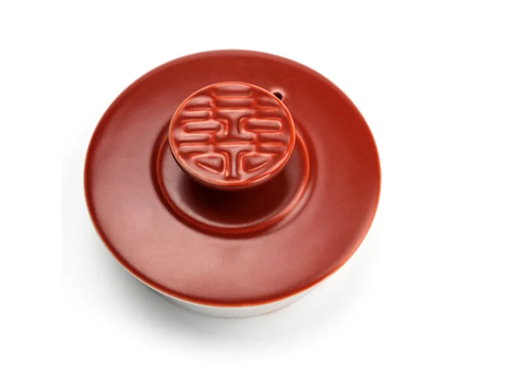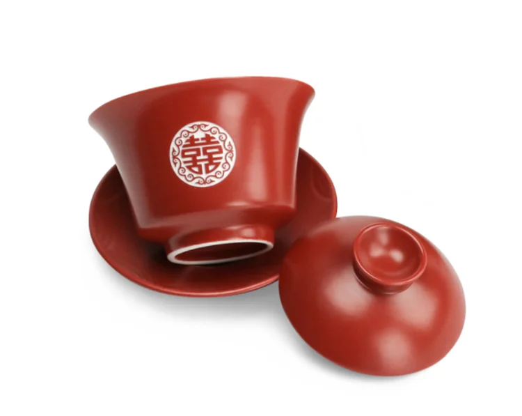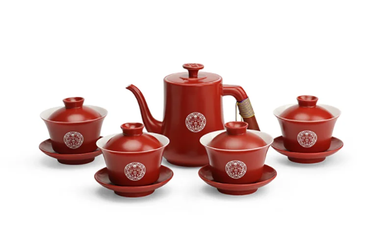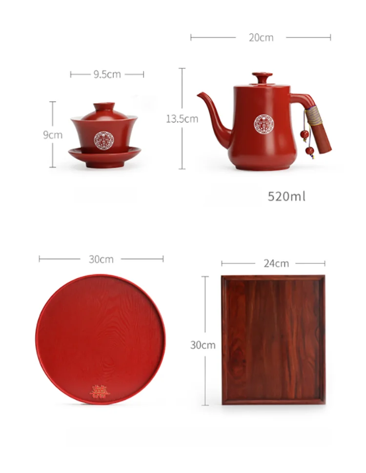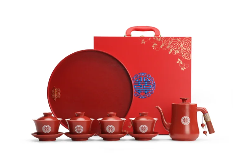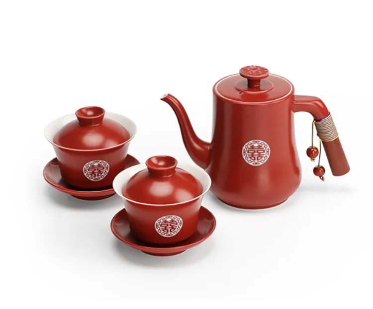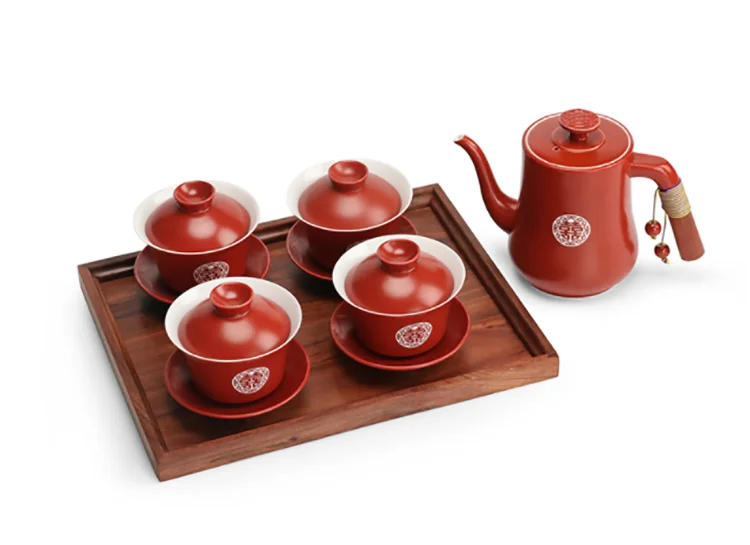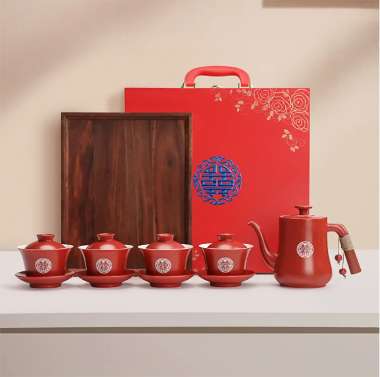 Chinese Wedding Supplies Red Ceramic Tea Set Teapot Gaiwan with Serving Tray Newlywed Party Souvenir Gift Porcelain
