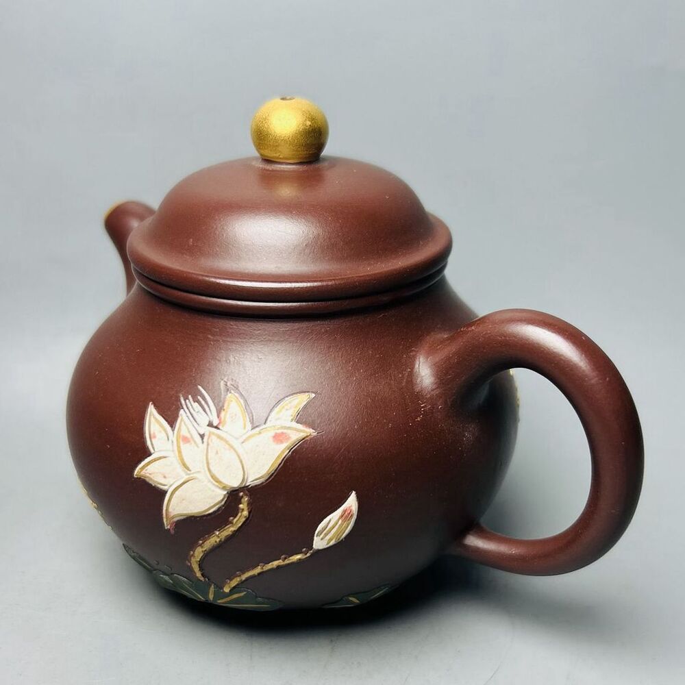 Chinese Yixing Purple Clay Teapot Zisha Ceremony Painted Fine Lotus Flower Rare