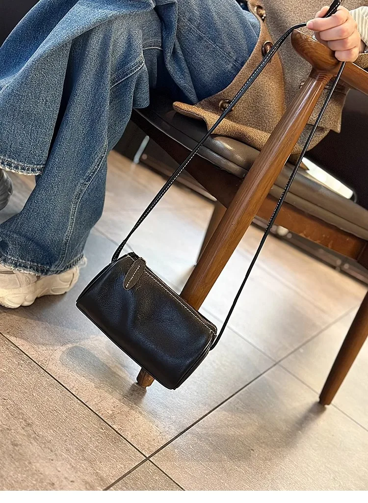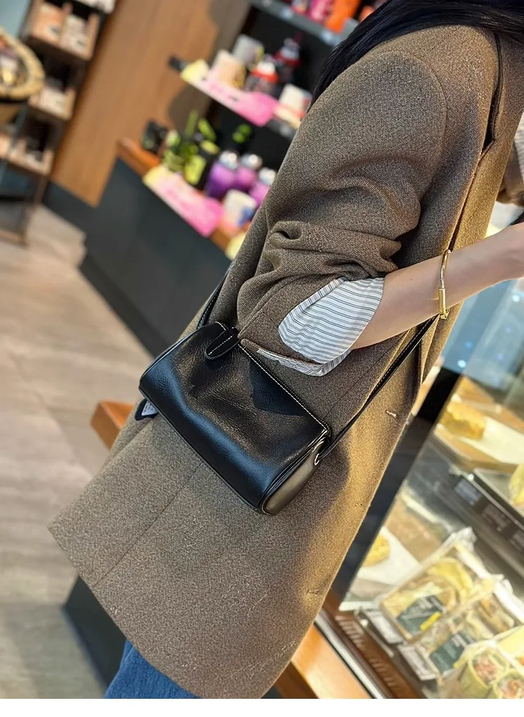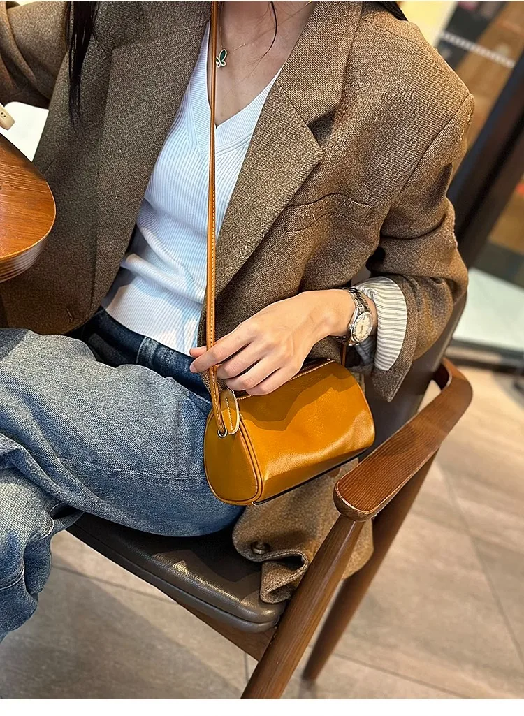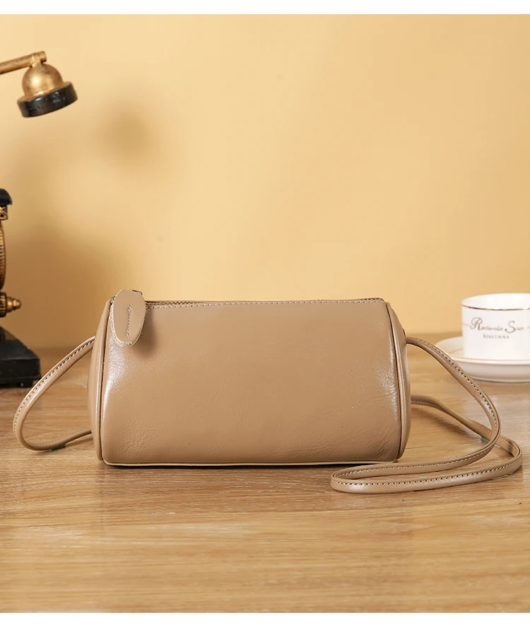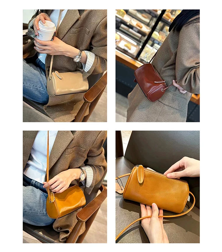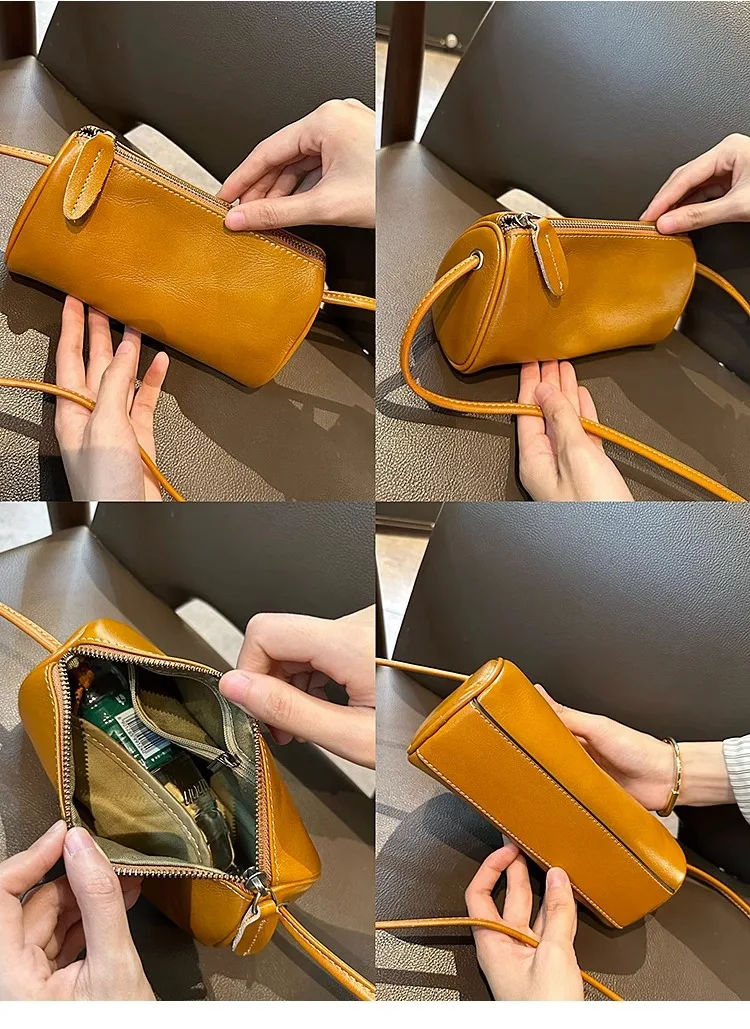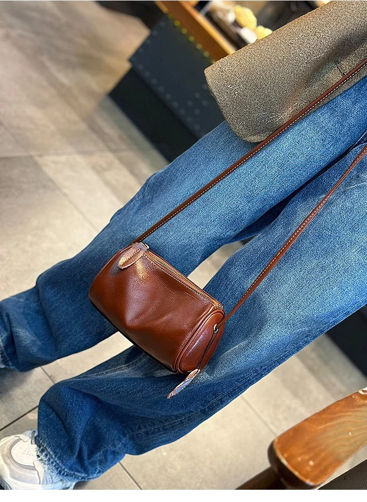 Cowhide Genuine Leather Popular Cylinder Bags Women's Retro Trendy Messenger Bag Women's Designer Shoulder Handbag for Ladies