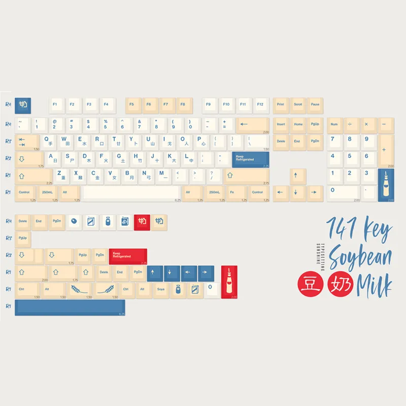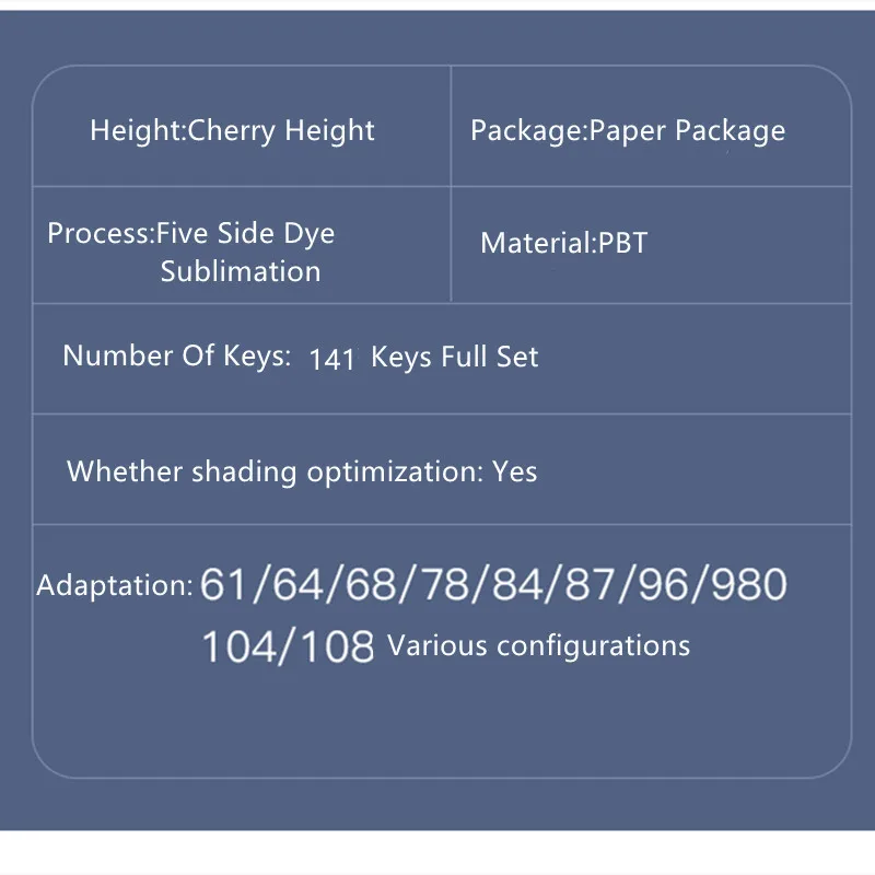 Total 141 keys, includes 1.75U, 2U shift and 1.5U ctrl alt,it is compatible with 61, 64, 68, 84, 87, 96, 980, 104, 108, etc.layout mechanical keyboard with MX switches