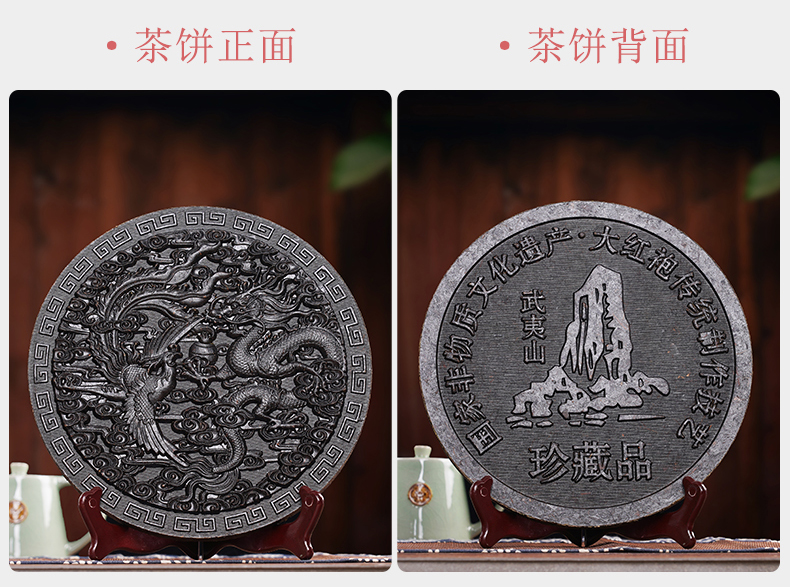 Just like Pu-erh tea, the taste of Rock teas from Wuyi Mountains get smoother with aging. For a time now, tea cakes compressed from great Wuyi teas such as Da Hong Pao have been made by some individuals for personal consumption and sometimes as gifts. The process closely follows the process used to create a once famous, Song Dynasty tribute tea cake called "Long Tuan Feng Bing" (Dragon Phoenix Tea Cake). The tightly compressed cake has Da Hong Pao in Chinese on the surface. This tea is ready for drinking now or it can be kept for further aging. Strong and full-bodied Da Hong Pao cake becomes more mellow and smoother as it ages.