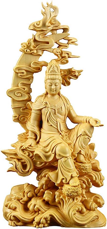 feng Shui 2020 Kuan yin Buddha Statue Luck and Wealth Pure Hand-Carved/Avalokitesvara Water/New Moon/Cloud Thousand/Hand guanyin Goddess Riding Lotus Dragon Home Decoration Wooden 18x8.5cm