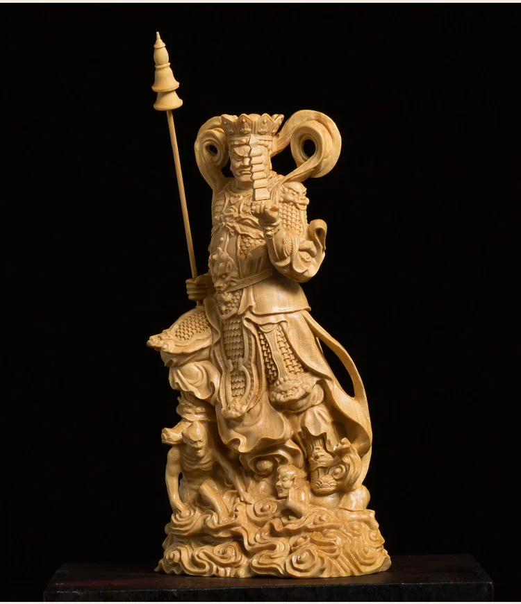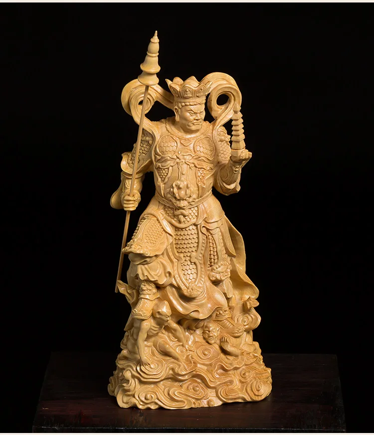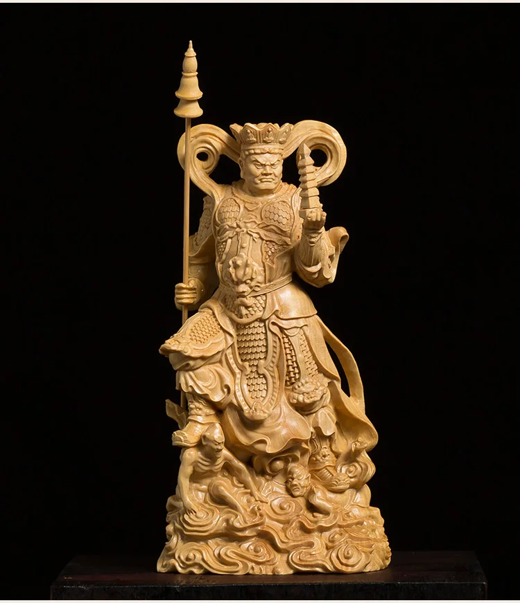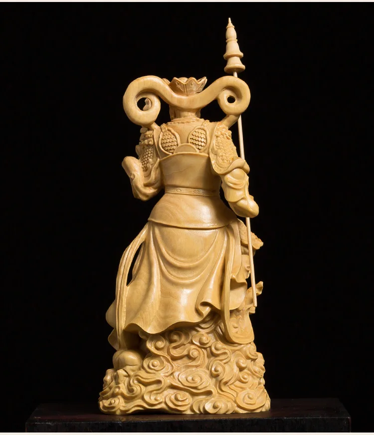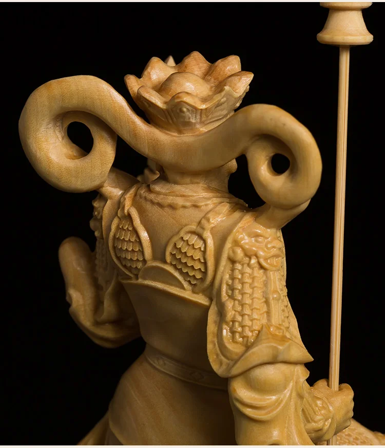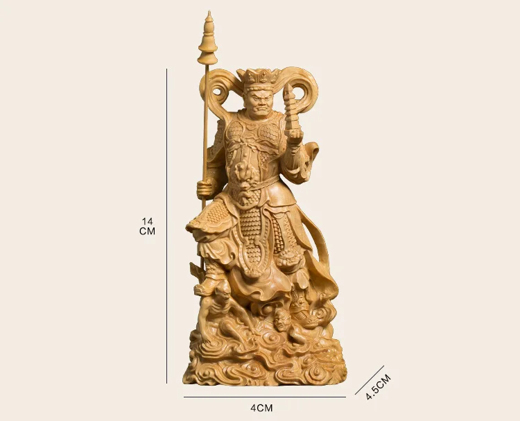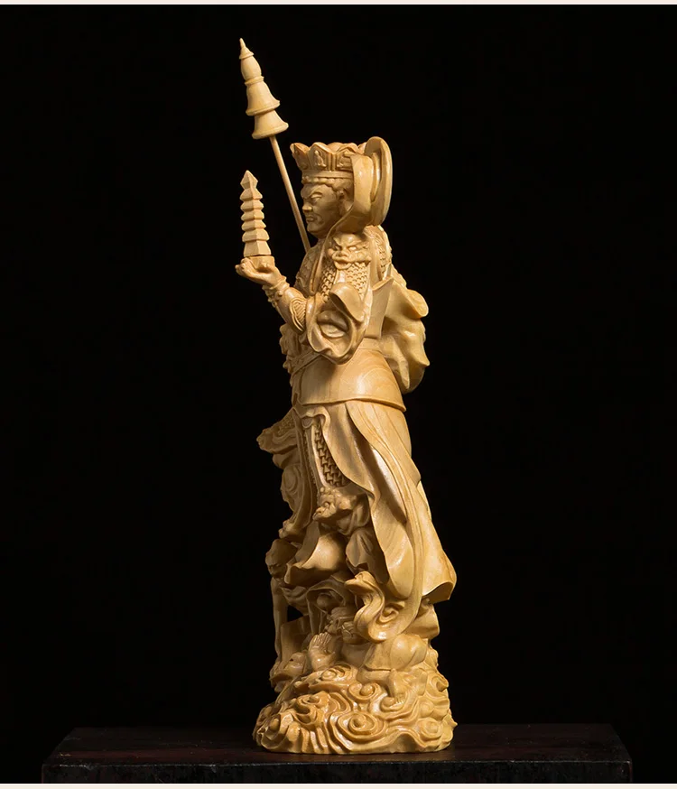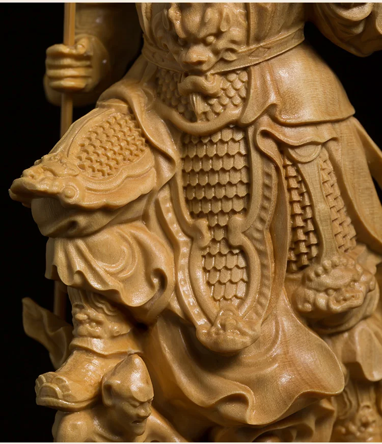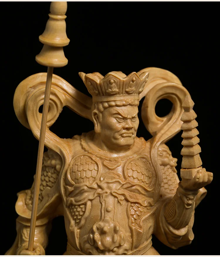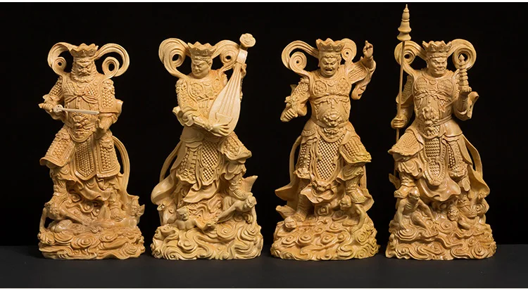 This stunning wood-carved statue features the Four Kings, powerful guardians in Buddhist tradition. Meticulously crafted, this sculpture exudes a sense of reverence and spiritual presence. With its intricate details and fine craftsmanship, it serves as a meaningful decoration for any space. Invite the protective energy of the Four Kings into your environment with this exquisite piece of art.