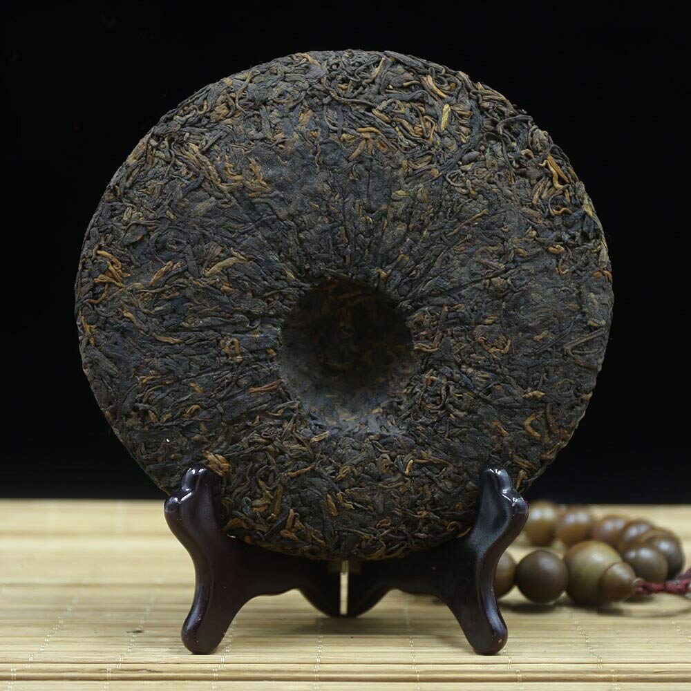 Haiwan shu Pu-erh tea cake, selected raw material from in Bada Mountain, dried tea leaves is strong and stout, since of tea this is aged, pu-erh cake's cotton paper gets many holes, dark chestnut color tea soup with plum and honey aroma, tastes mellow and thick, smoothly, obviously sweet aftertaste.