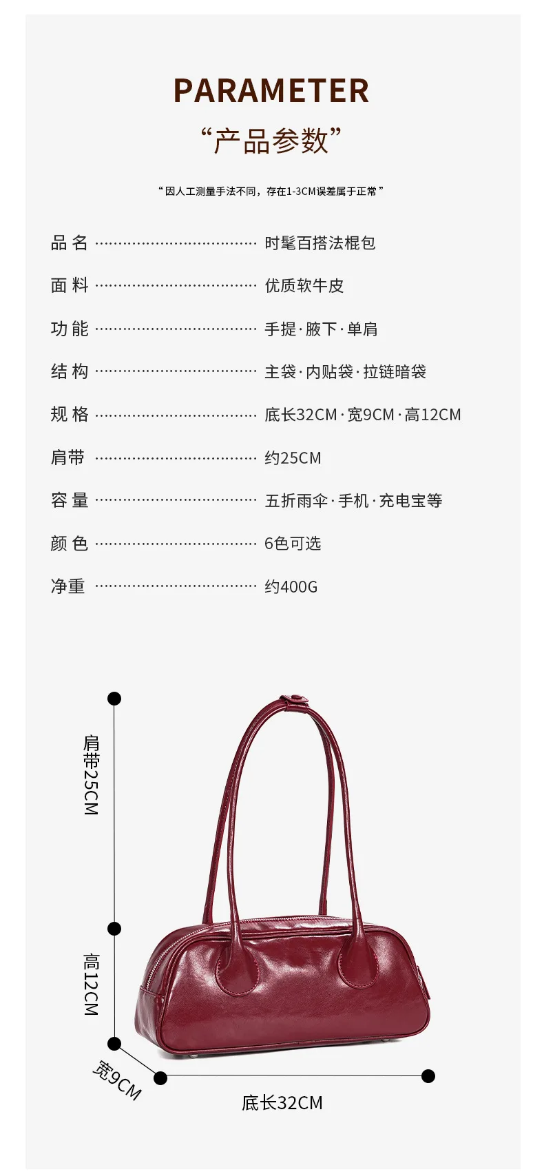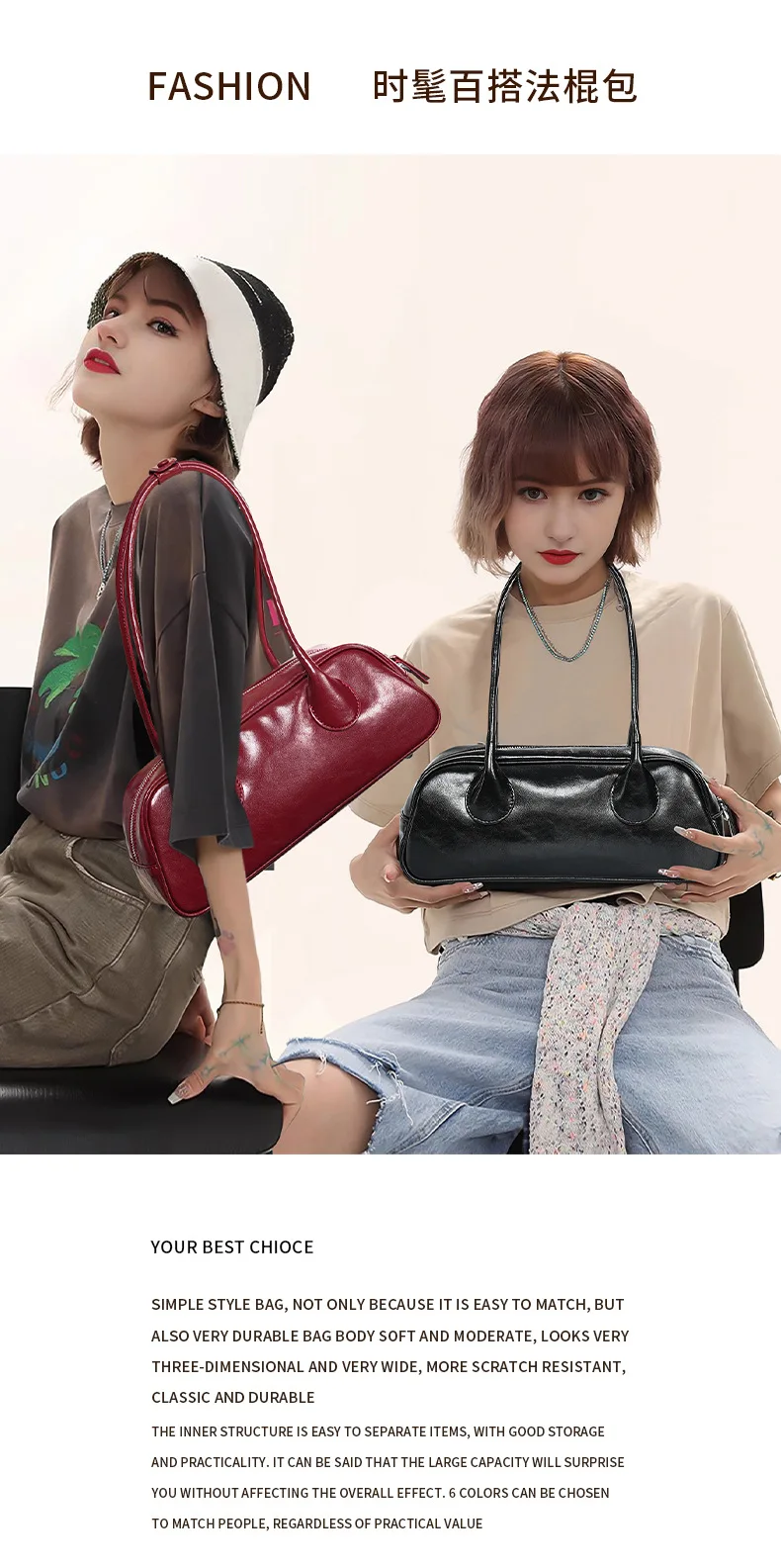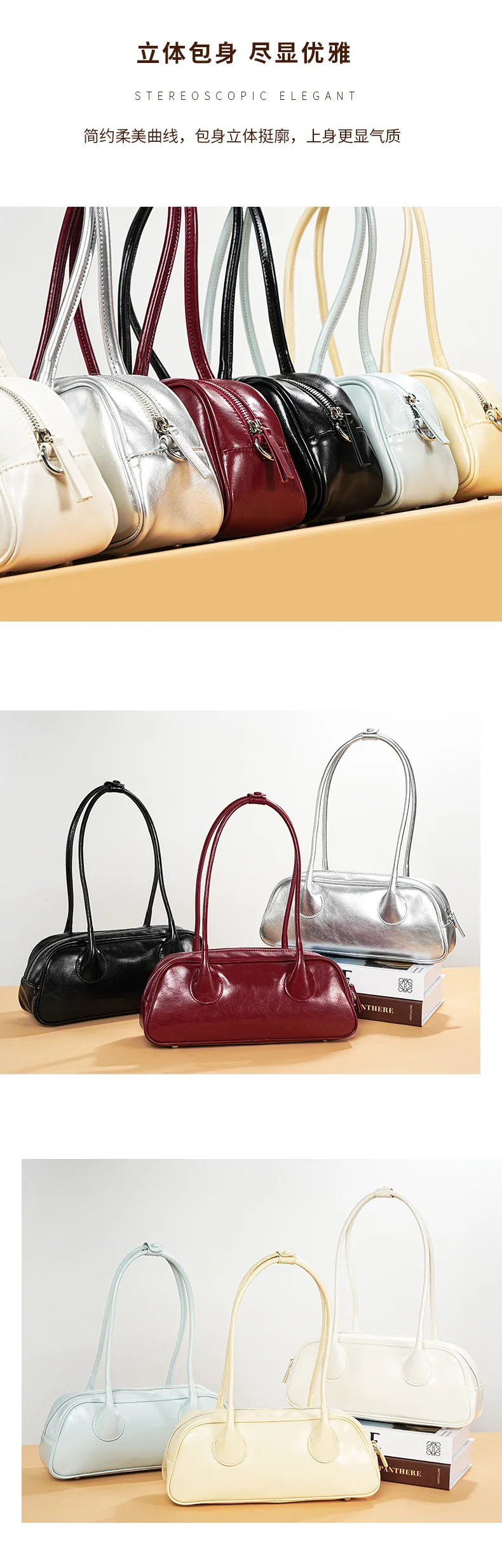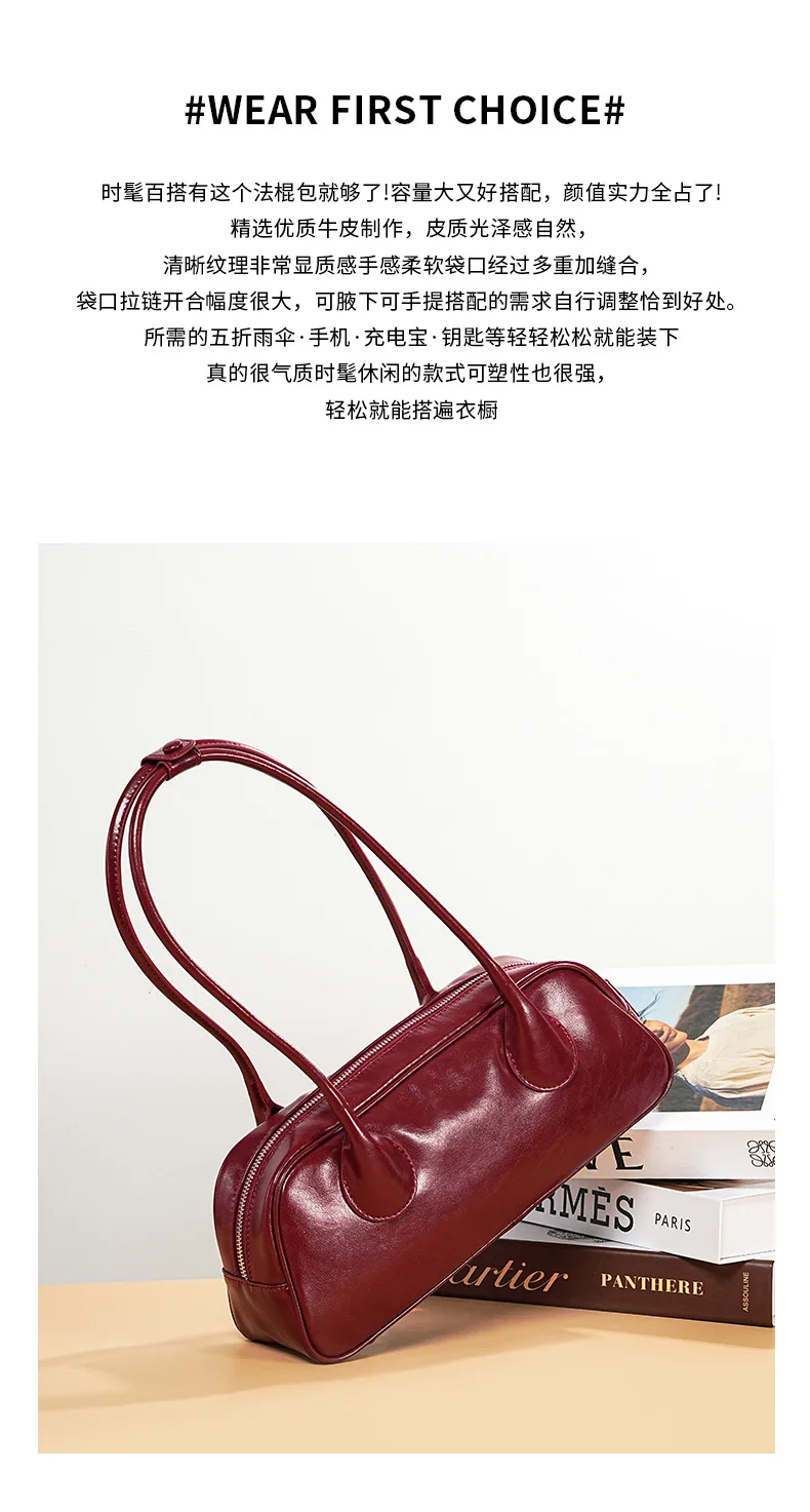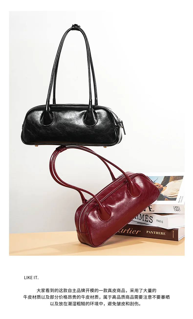 包包女新款小众时尚真皮保龄球腋下单肩包 牛皮大容量手提法棍包