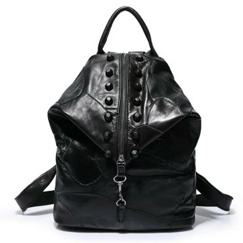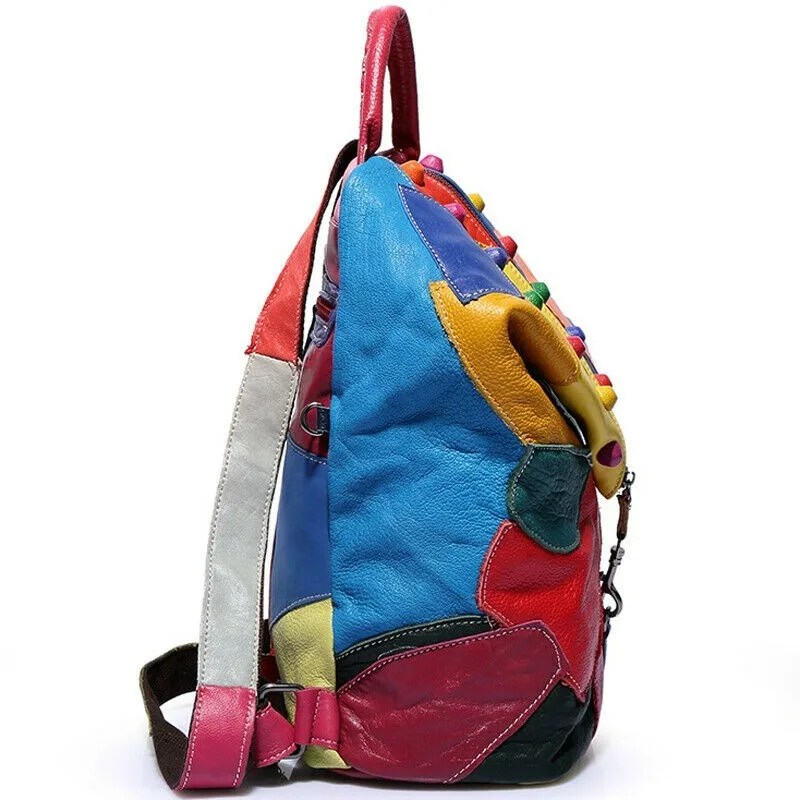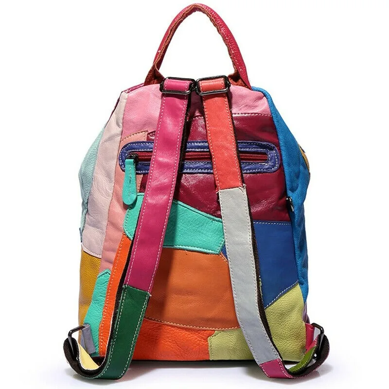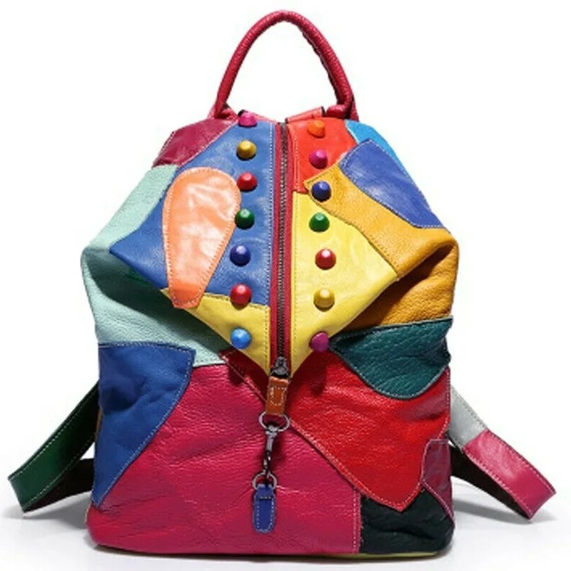 Genuine Leather Cowhide Women Backpack Colorful Blocks Patchwork Backpack Travel Bag Rucksack