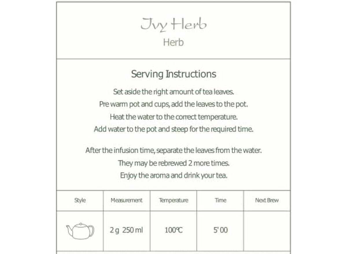 Ivy leaf is packed with a range of nutrients, which explains why this herb has so often been used as traditional medicine. Like all of the herbs we sell, these ivy herbs have been specially grown, selected and prepared to ensure that they reach you in the best possible condition. This way, you'll have all of the nutrients and beneficial compounds that you'd find in this herb as it grows on the vine. 100% natural and 100% Organic We strongly believe that the higher quality a product, the more benefits it brings - because it's loaded with the right substances. That's why we search around the world for the finest produce. Product Description