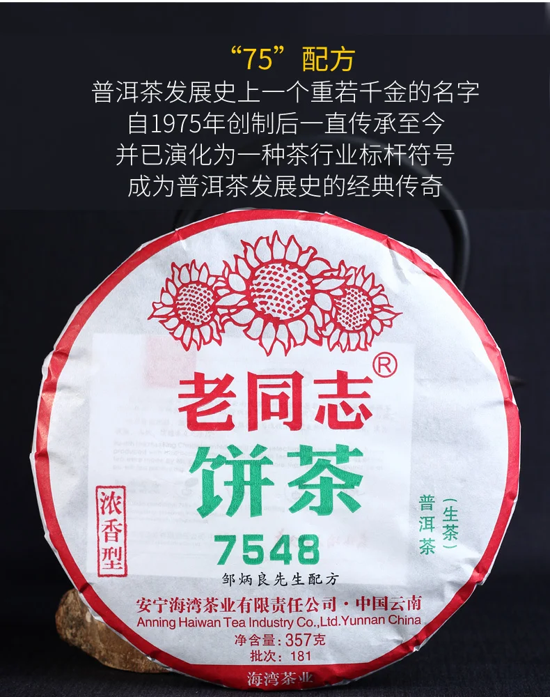 Product detail: Product name: Haiwan 7548 Sheng Pur-erh Strong-flavor Batch Raw Pu-erh Tea Cake 357g Production date:2018 Year. 181 batch. Puer type: Raw puer tea Packing specification: 357g / Pcs Storage: Avoid sunlight, ventilation places Shelf time: The longer the better Manufacturer:Anning Haiwan Tea Industry Co.,Ltd.