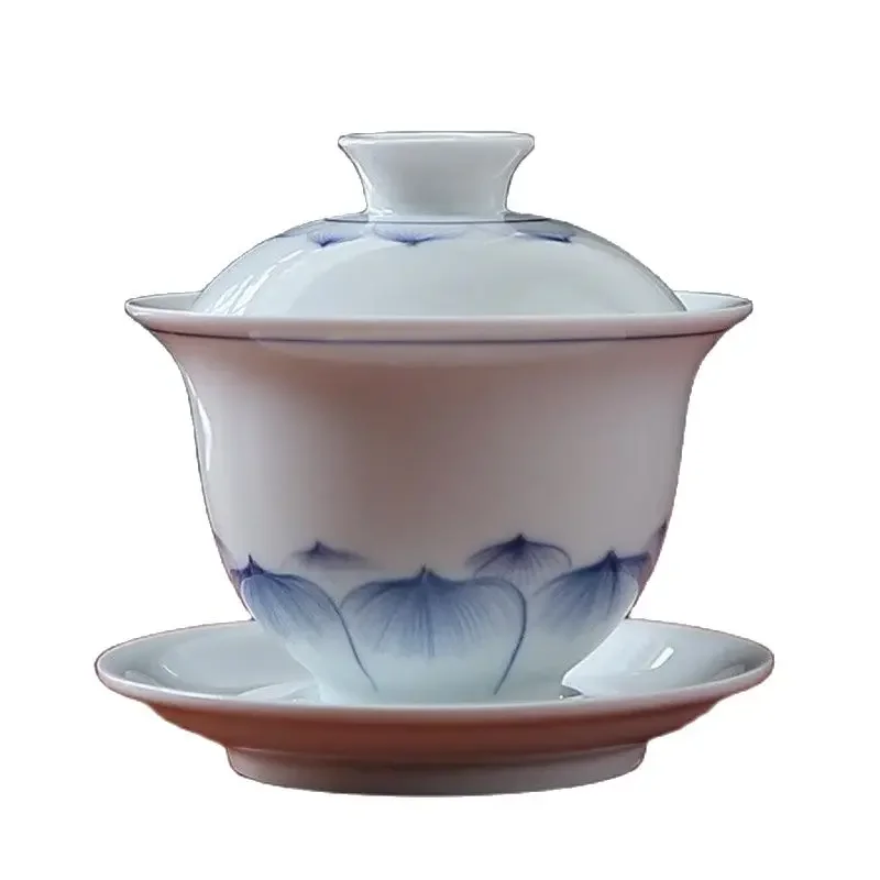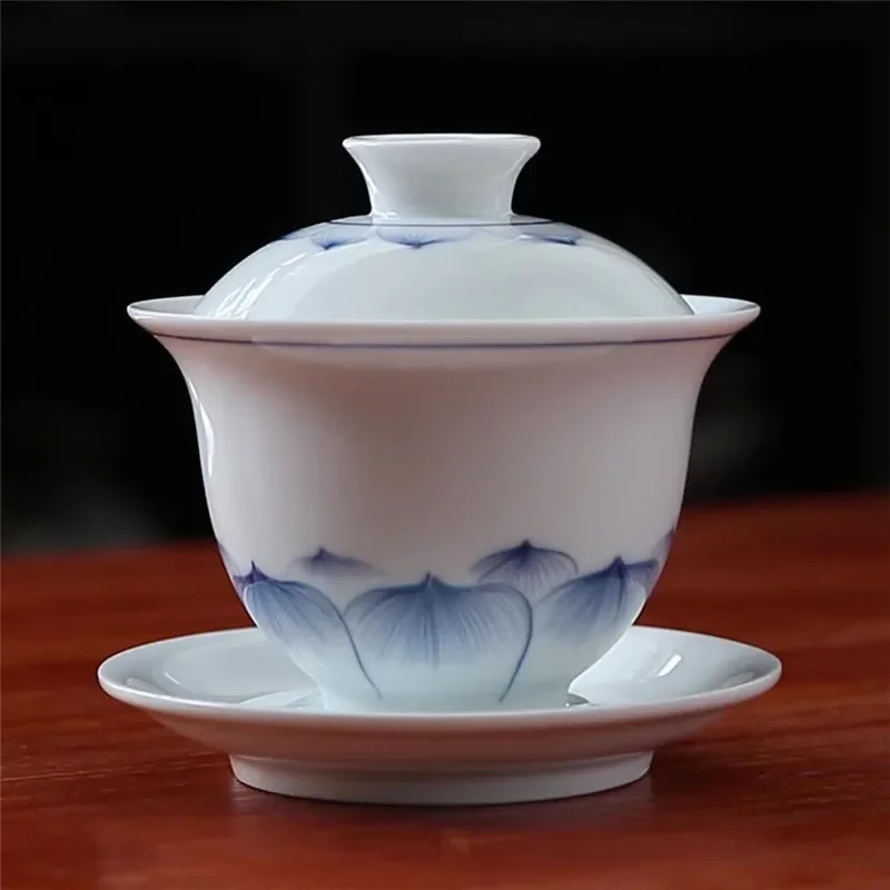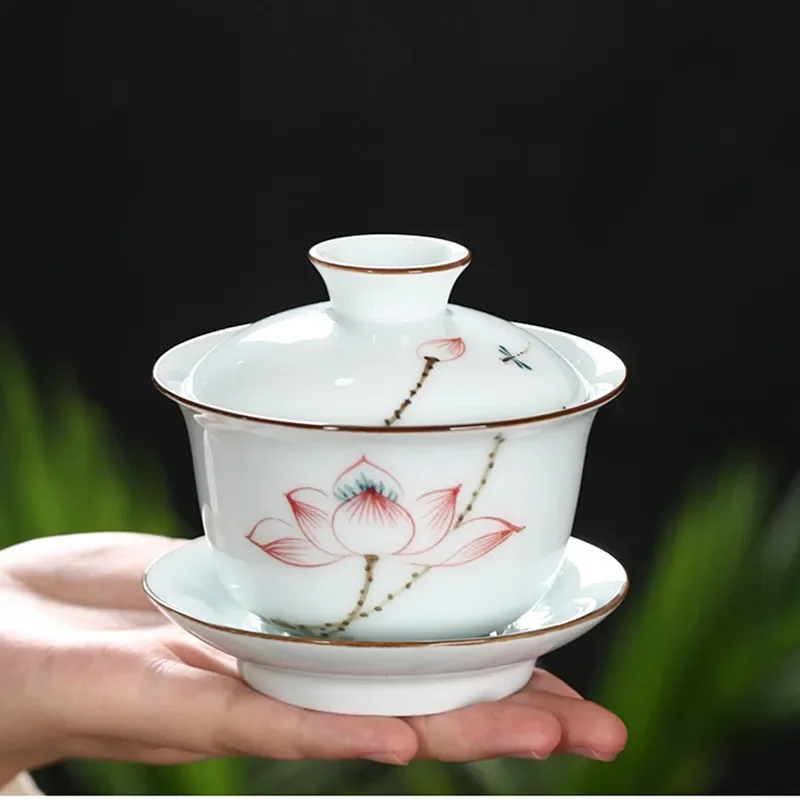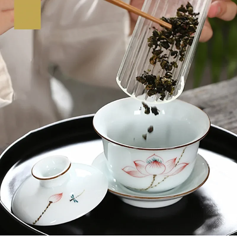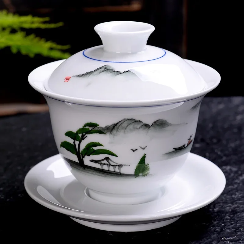 Hand-painted Ceramic Tea Tureen Chinese Portable Tea Maker Three-cai Gaiwan Home White Porcelain Tea Set with Cover Teacup 200ml