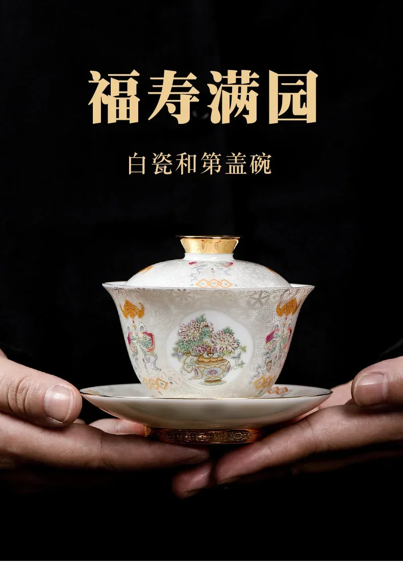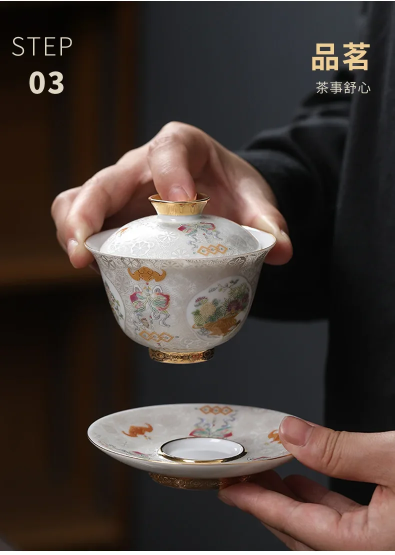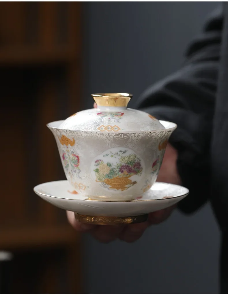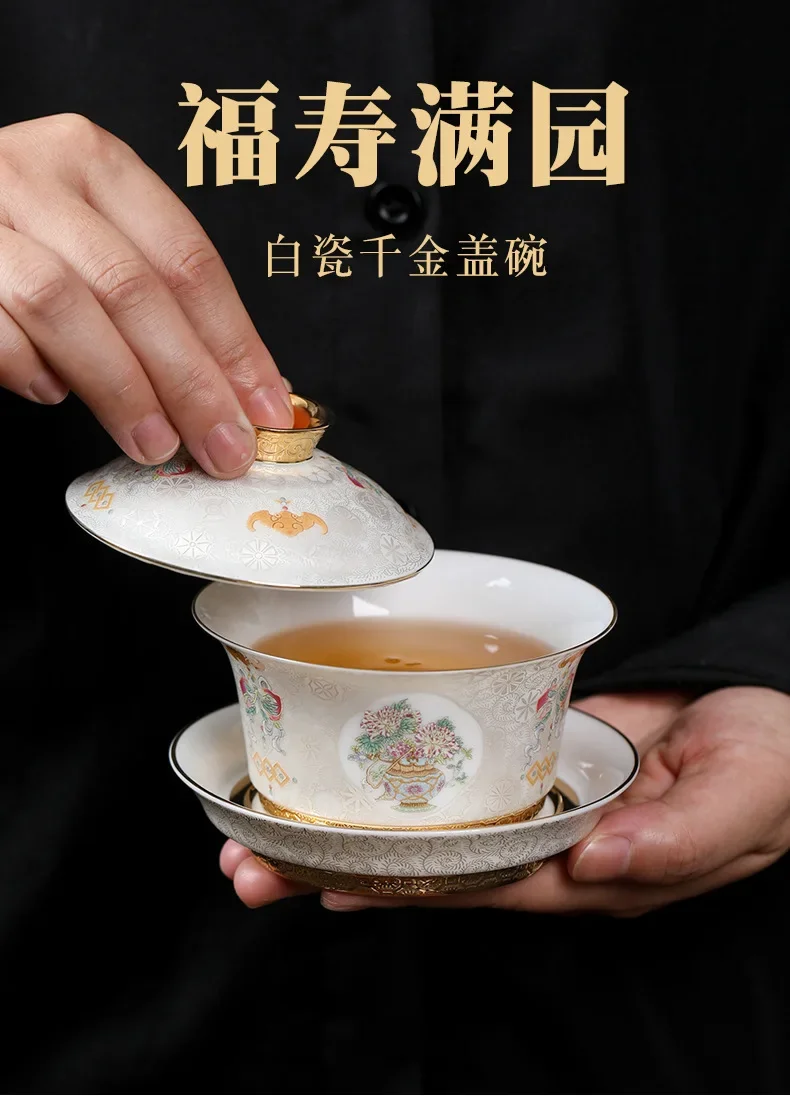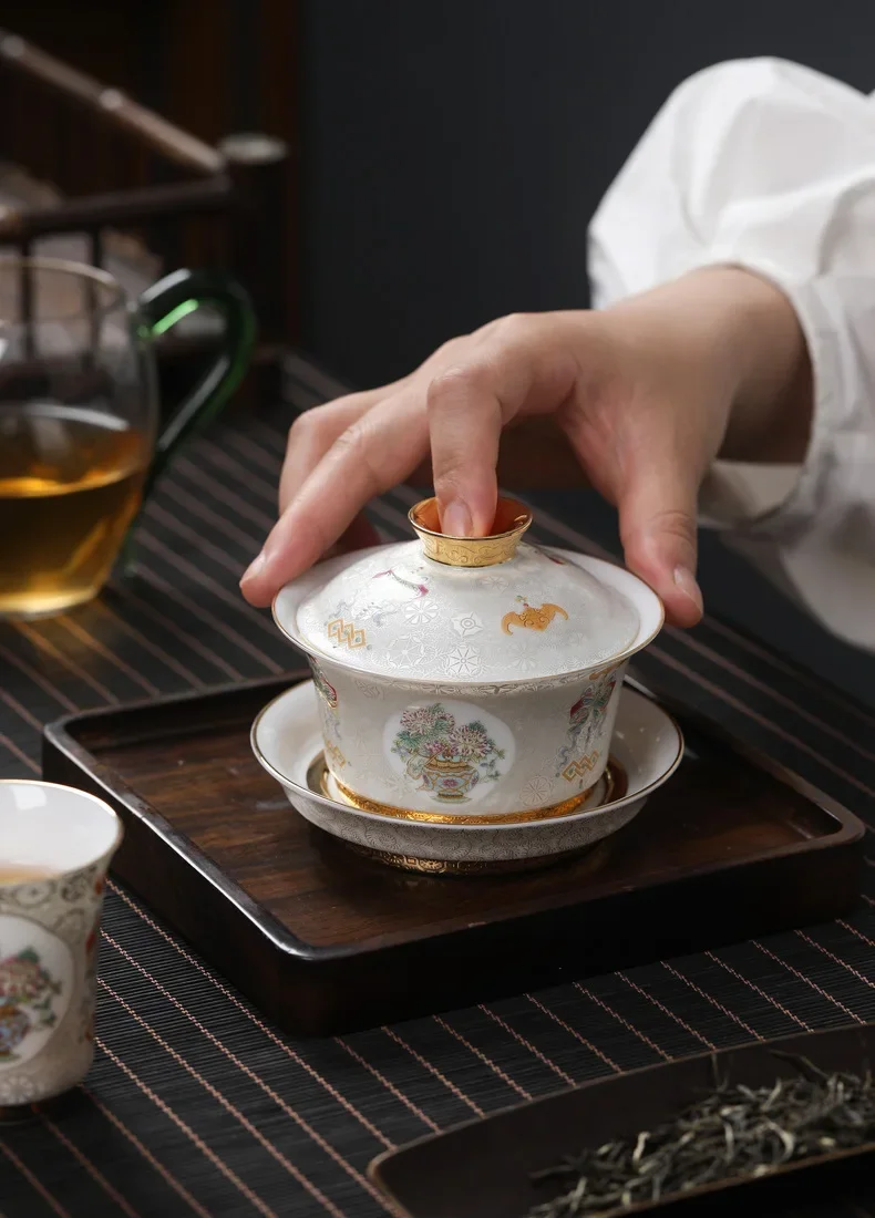 Handcrafted Goldpalace Enamel Colored Gaiwan Aesthetic Ceramic Bowl with Lid Tea Tureen Tea Maker Cover Bowl Teaset Collection