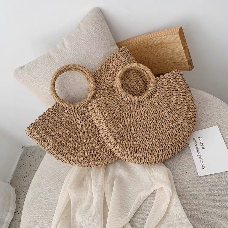 Handmade Bags Pompon Beach Weaving Straw Bag Wrapped Beach Moon Shaped Purses