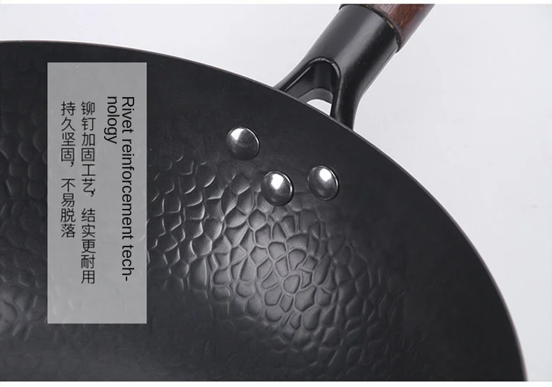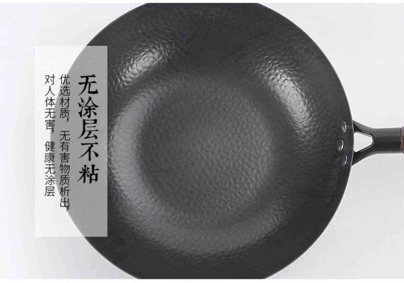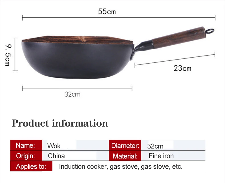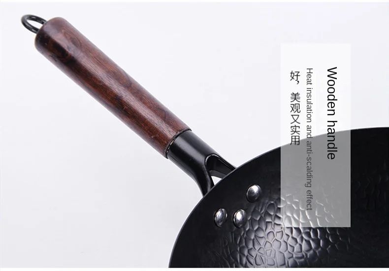 Handmade Cast Iron Wok 32cm Non-stick Skillet Wok Pans Household Cooking Pot Wooden Cover Gas Stove Induction Cooker Universal