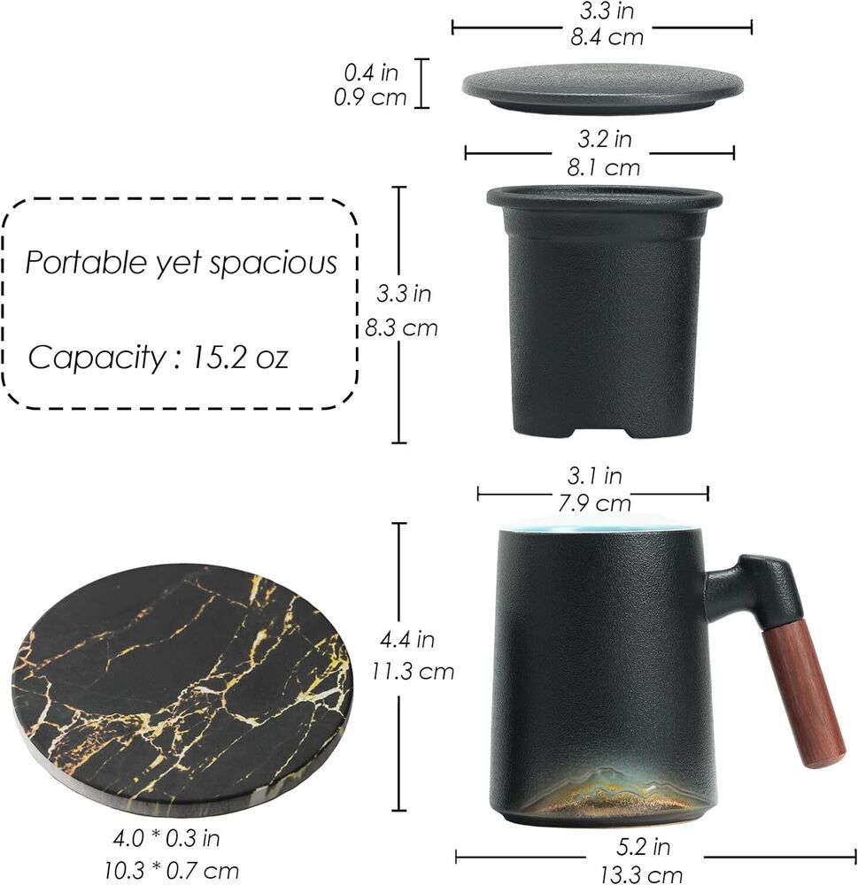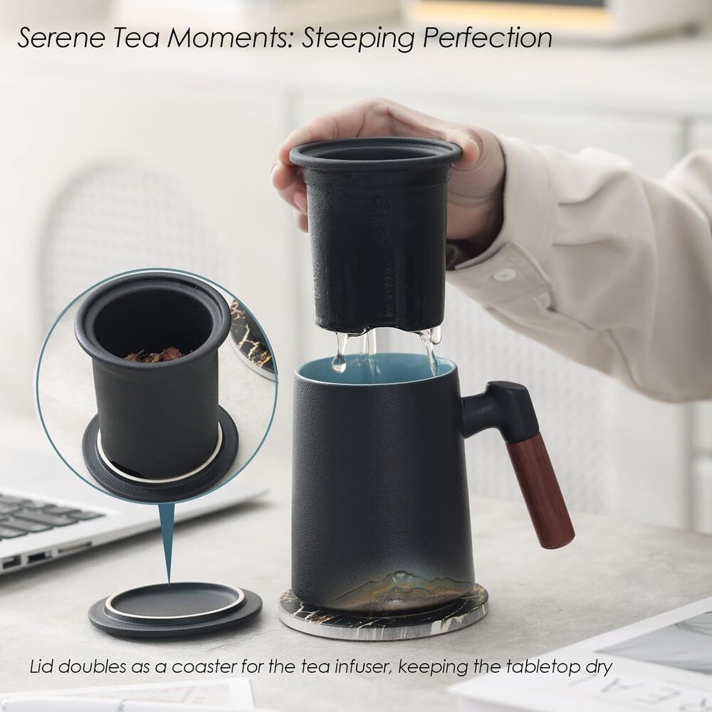 [Enhanced Tea Filter & Absorbent Ceramic Coaster]: Equipped with a ceramic and 304 stainless steel loose tea leaf steeper, ensuring a clean and delightful brew, free from tea residues. Our ceramic mug also features a heat-resistant ceramic absorbent coaster, efficiently absorbing tea water to keep your tabletop clean and protect your desk.