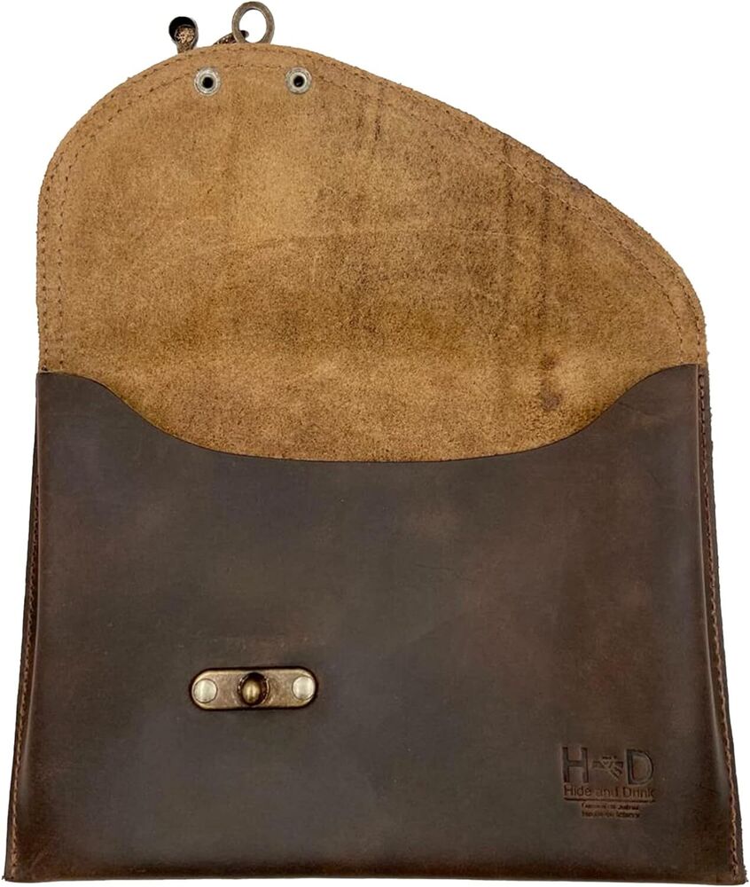 This beautiful Clutch Bag is handcrafted with the finest Full Grain Leather to carry your personal belongs and accentuate your favorite outfit. Handcrafted with supple, Bourbon Brown Leather, the beautiful clutch bag has a unique, attractive Brass Metal clasp that is perfect for all occasions. The inside lining is soft and smooth, ensuring protection to your phone from any scratches or marks. All Hide & Drink leather products are handmade from rustic, durable, Full Grain Leather. Our Full Grain Leather comes from the top layer of the hide, and has all the natural full grain characteristics of the hide...hence the name. It's the best leather you can buy and the only leather that we use. The flesh side of the soft leather is first stained with natural drab tone and finished with our proprietary beeswax conditioner. Our unique treatment helps the leather to retain its shape without the aid of synthetic stabilizers, offering a natural and durable look. Product Features