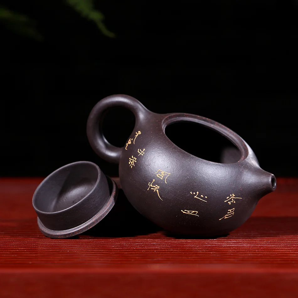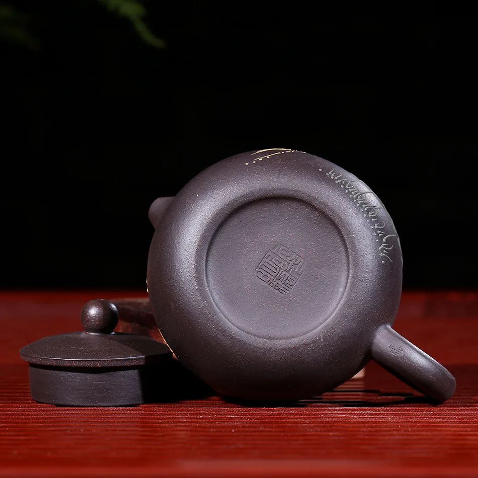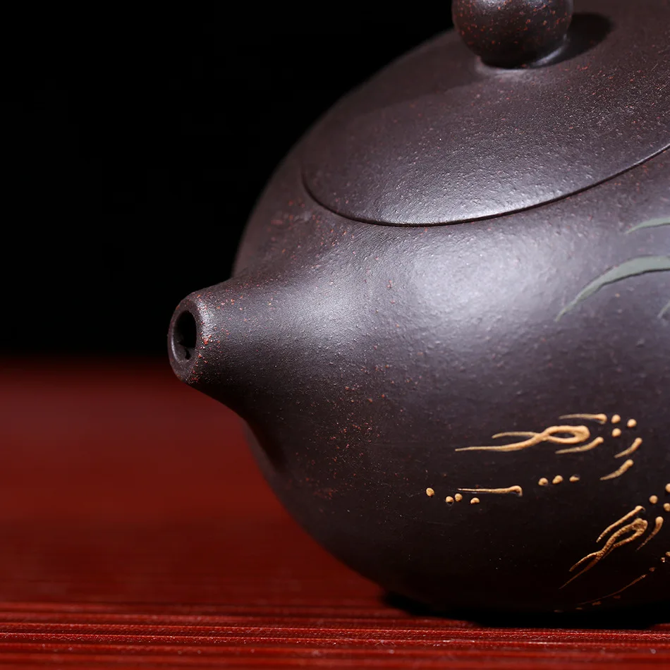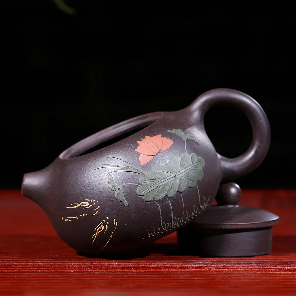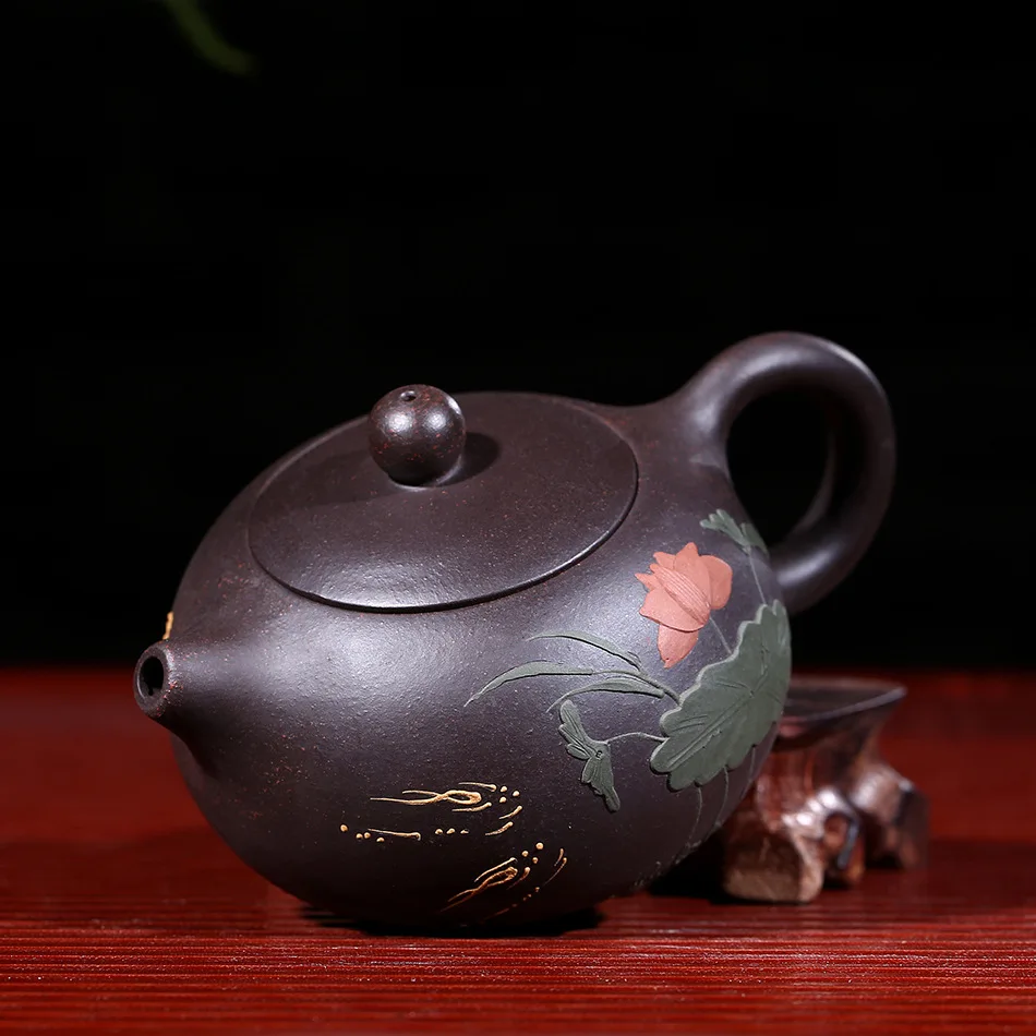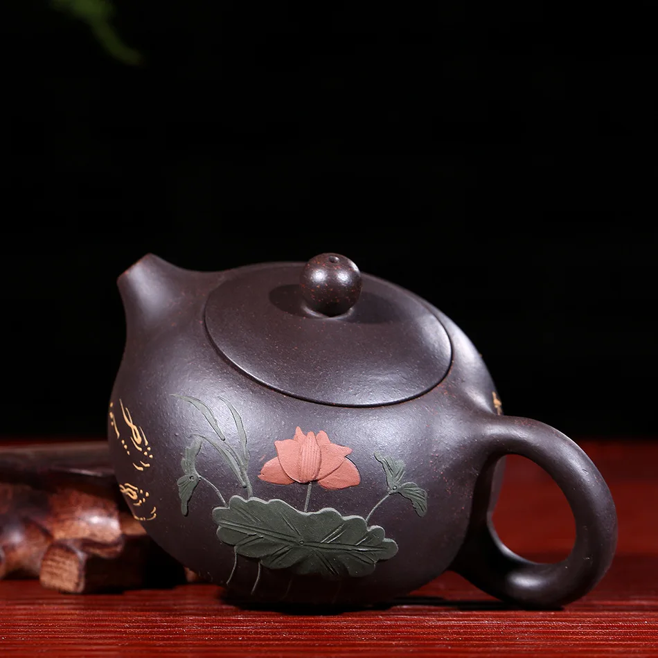 Raw ore black mud yixing teapot pure hand handmade colourful Mud painted lotus Xi Shi pot Purple Clay 188 ball hole