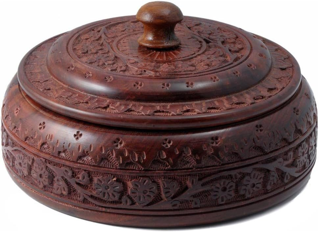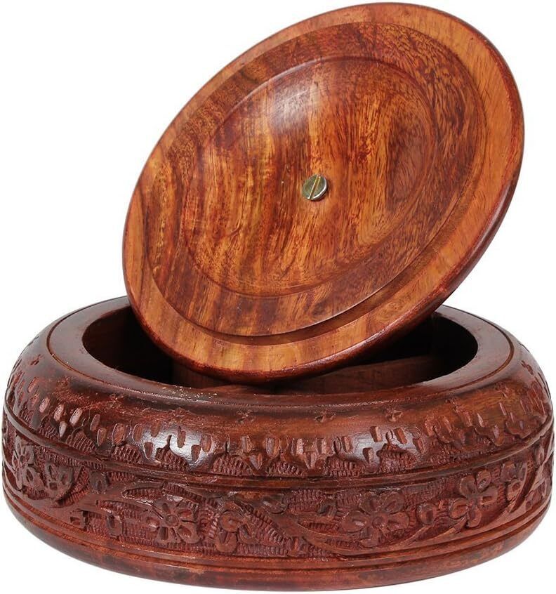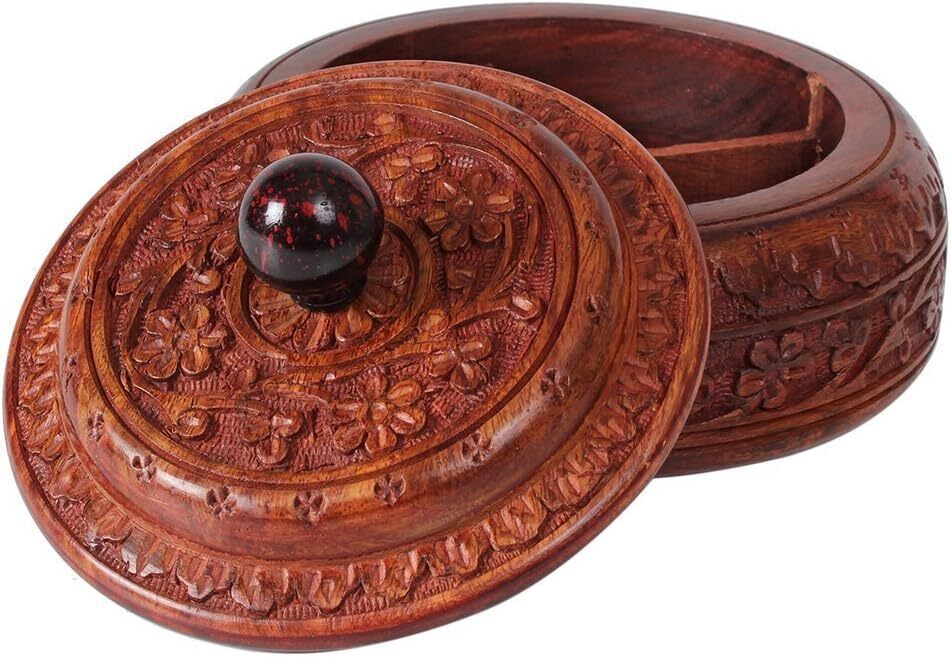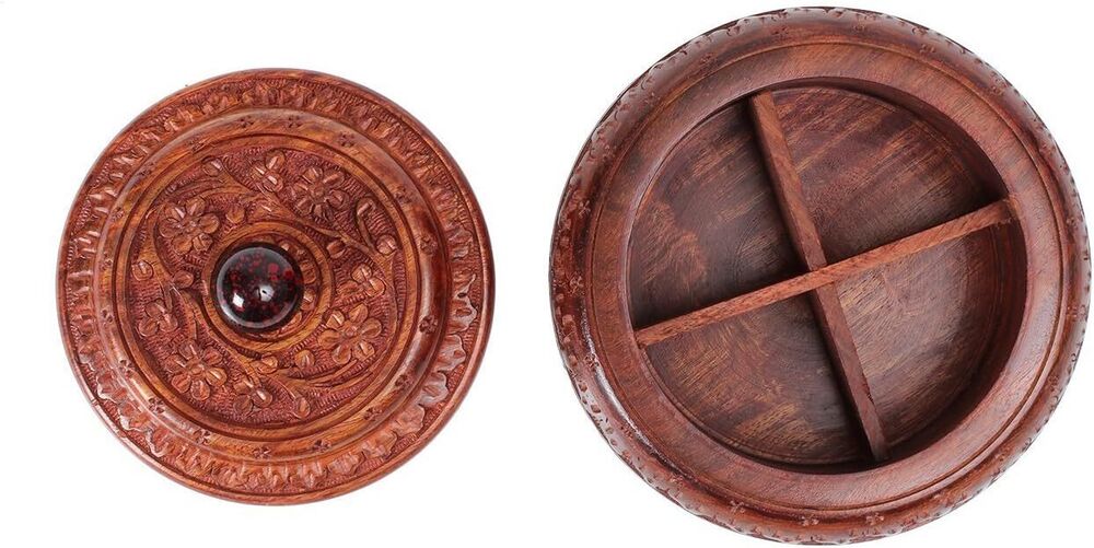 - Crafted using one of the finest richly hued timbers, rosewood and further adorned with rustic multifaceted carved floral designs. Beautiful wooden box with removable lid provides 4 compartments to store spices, pills, saunf & more