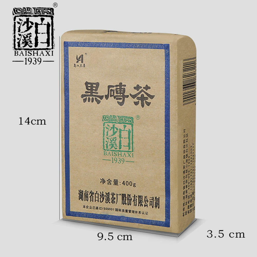 Product Name: Anhua Baishaxi Hei Cha Zhuan Dark Tea Brick Raw material: High grade dark maocha Form: Compressed Brick Tea Origin: Hunan province, China Tea Type: Dark Tea Net Weight: 400g Shelf life: The longer the better Storage Method: In ventilation, dry and no odor, storage in normal temperature environment . China Manufacturer: Hunan Provincial Baishaxi Tea Industry Co. Ltd