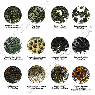 1. Nonpareil Supreme Organic Anxi Tie Guan Yin Chinese FuJian Oolong Tea ---8g; 2. Top Grade Organic Anxi Tie Guan Yin Chinese FuJian Oolong Tea ---8g; 3. Organic Supreme Taiwan High Mountain Jin Xuan Milk Oolong Tea ---8g; 4. Organic Supreme Taiwan High Mountain Dong Ding Oolong Tea ---8g; 5. Premium Organic Lan Gui Ren Taiwan Ginseng Renshen Oolong Tea ---8g; 6. 100% Organic Premium King grade China Jasmine Dragon Pearl GREEN TEA ---8g; 7. Supreme Da Hong Pao Big Red Robe Wuyi Mountain Rock Oolong Tea ---8g; 8. Supreme Organic Wuyi LaoCong Shui Xian Shui Hsien ShuiXian Rock Oolong Tea ---8g; 9. 2005 Organic Supreme Aged Yunnan GongTing Puer puerh Ripe Loose Black Tea ---8g; 10. Supreme Oraginc Chinese Wuyi Golden Buds Jin Jun Mei Golden Eyebrow Black Tea ---5g; 11. Premium WuYi Zheng Shan Xiao Zhong Lapsang Souchong Black Tea ---5g; 12. Premium Pure Wild Kunlun Coreopsis tinctoria Snow Chrysanthemum Flower Herbal Tea ---5g;