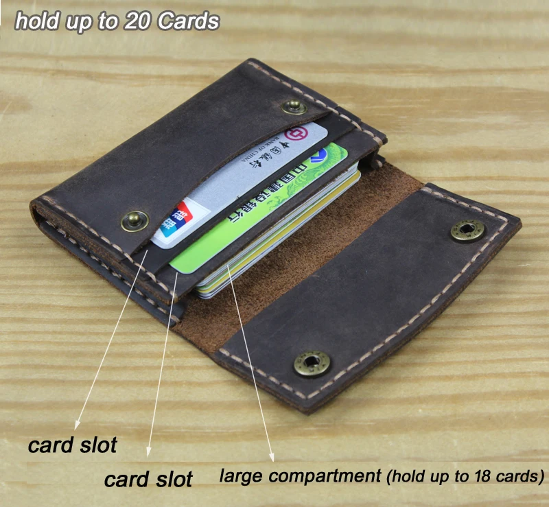Structure: with button cover to close the card holder , 2 card slots + 1 large card compartment (larger capacity, can hold larger certificate: driving lisence ect. )