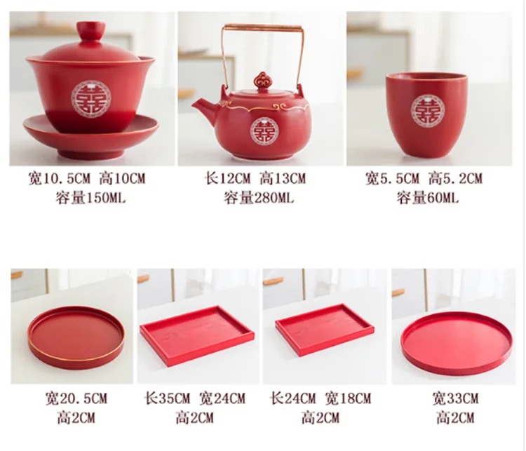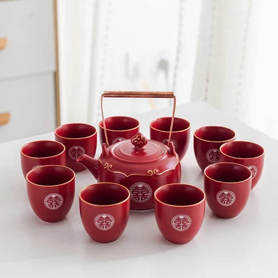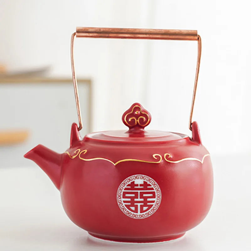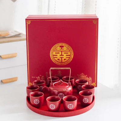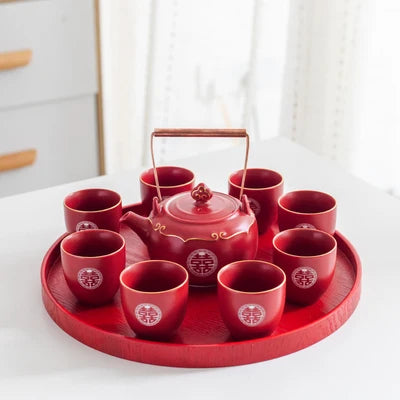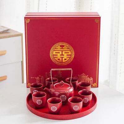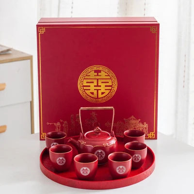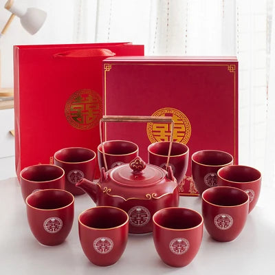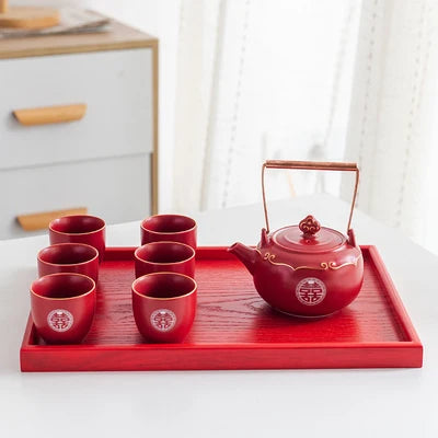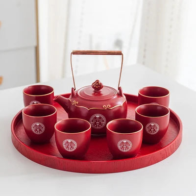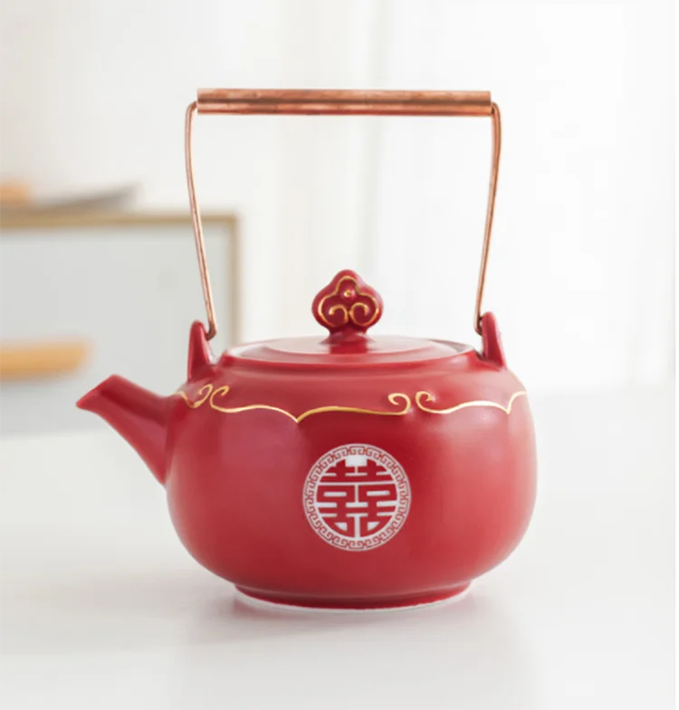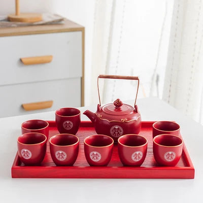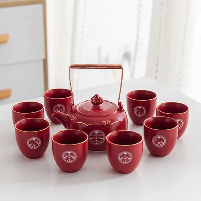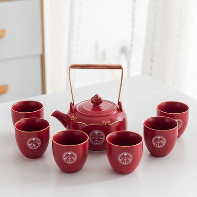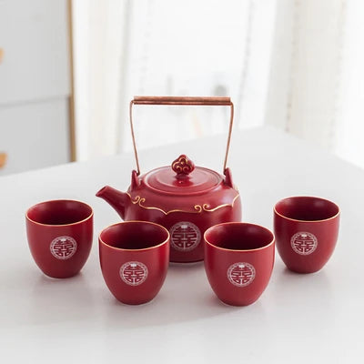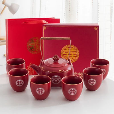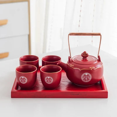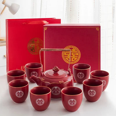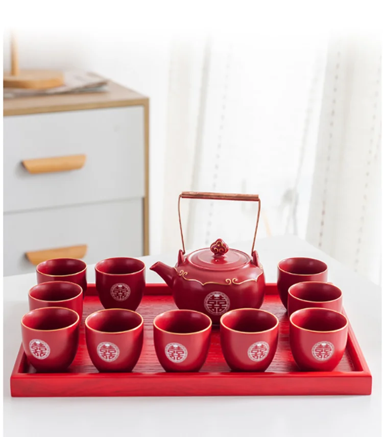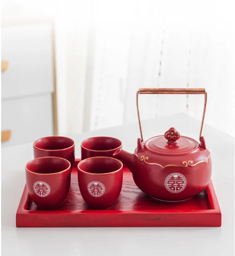 Household Red Ceramics Teapot Teaware Double Happiness Tea Pot and Cup Set Customized Wedding Newlywed Souvenir Gift Supplies