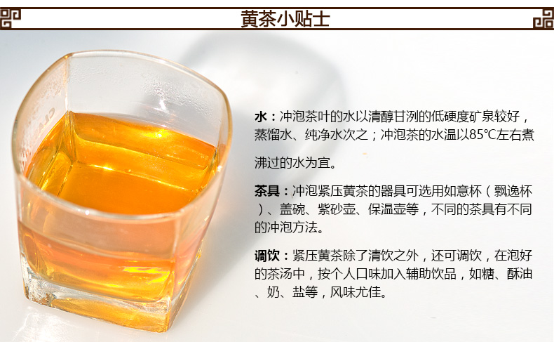 Jun Shan yellow tea is processed similarly to green tea, but after the first firing it undergoes steaming followed by a prolonged “resting” wrapped in cloth or paper. This stage called men huan may last a day or two before the final firing. The moist pause allows the leaves to breathe back their own aromas and prevents the astringency associated with some green teas. It also gives the leaves a very slight yellow cast. The initial firing halts most of the oxidation, but similar to white tea it is very slightly oxidized.As a result, it produces bright yellow color, refreshing flavor and sweet and mellow taste that are the characteristics of yellow tea.