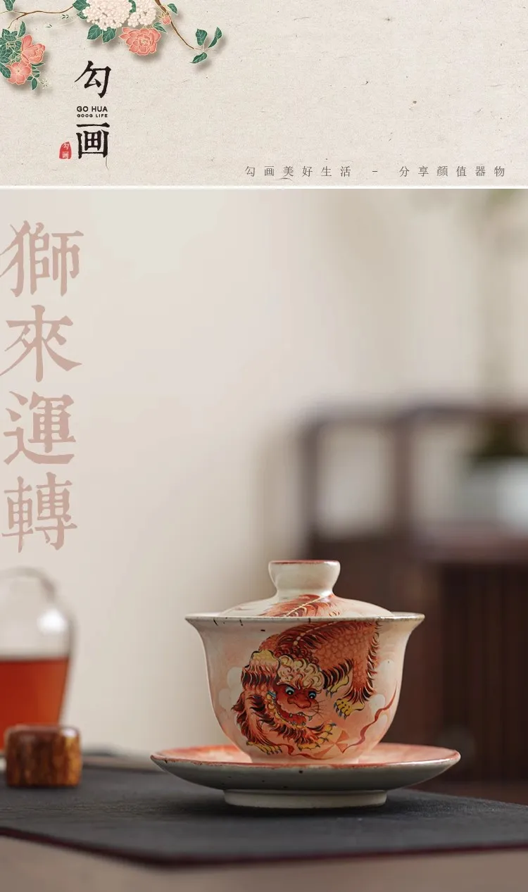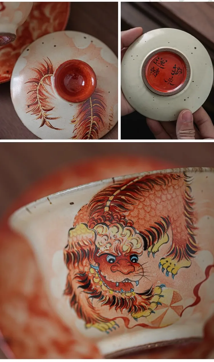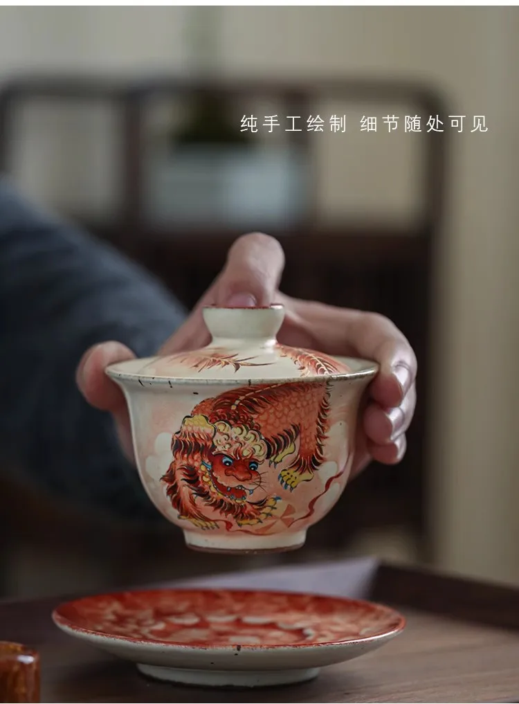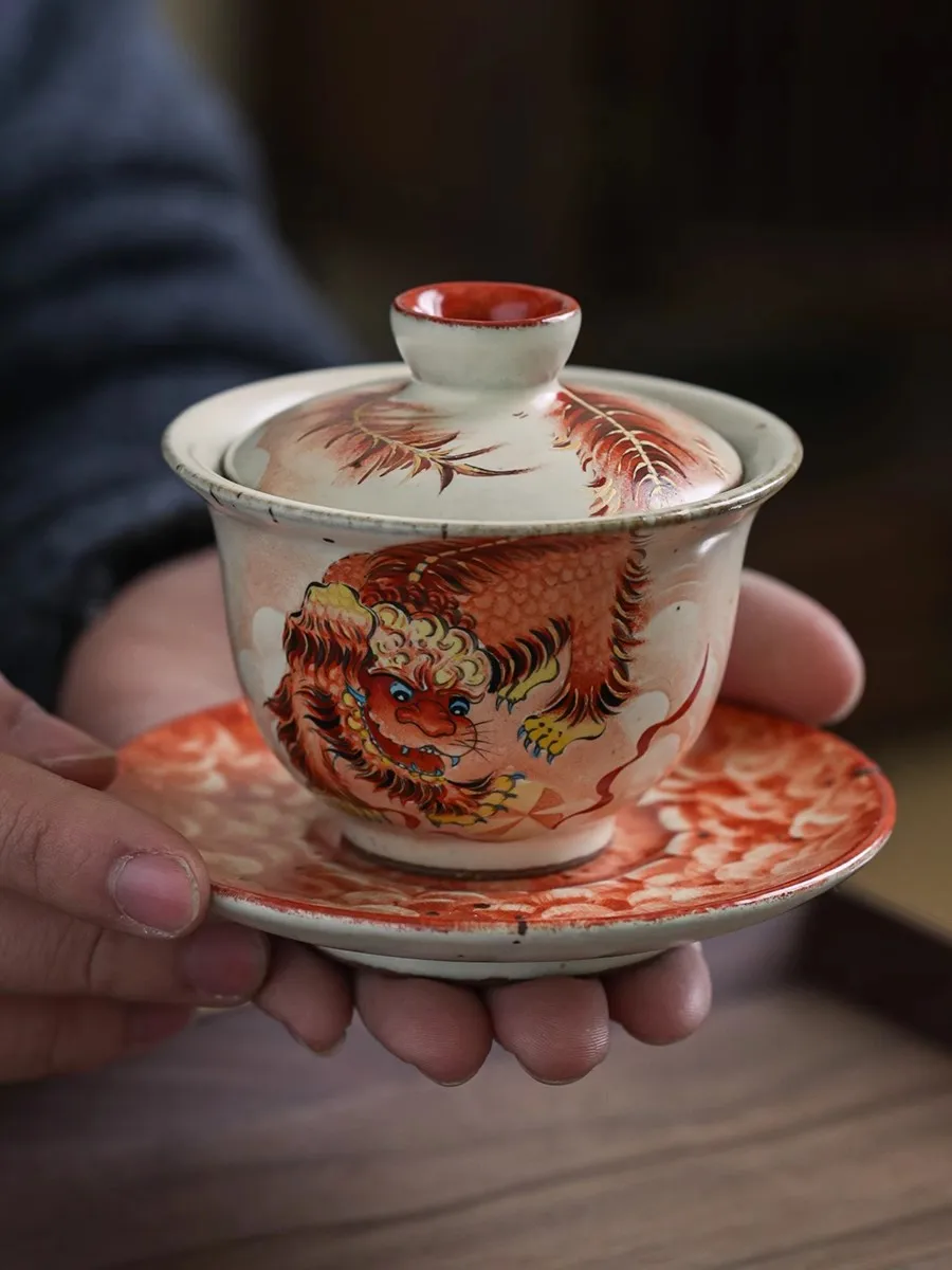 Hand-painted Ceramic Lion Rough Pottery Sansai Gaiwan Palace Style