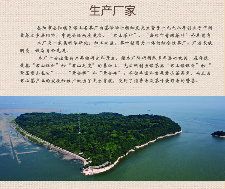 Jun Shan Huang Cha tea is a yellow tea from Junshan Island of the Hunan Province in China. It is one of Chinese Famous Teas. Junshan yellow tea is only produce using the tea leaves from the tea garden at the Junshan Island, which is located in the middle of Dong Ting Lake of Hunan Province. The best quality Jun Shan tea is called as Jun Shan Yin Zhen. The production of Jun Shan Yin Zhen demands that tea pickers pluck only buds while the golden brick is made with the material picked as one bud and one leaf system.