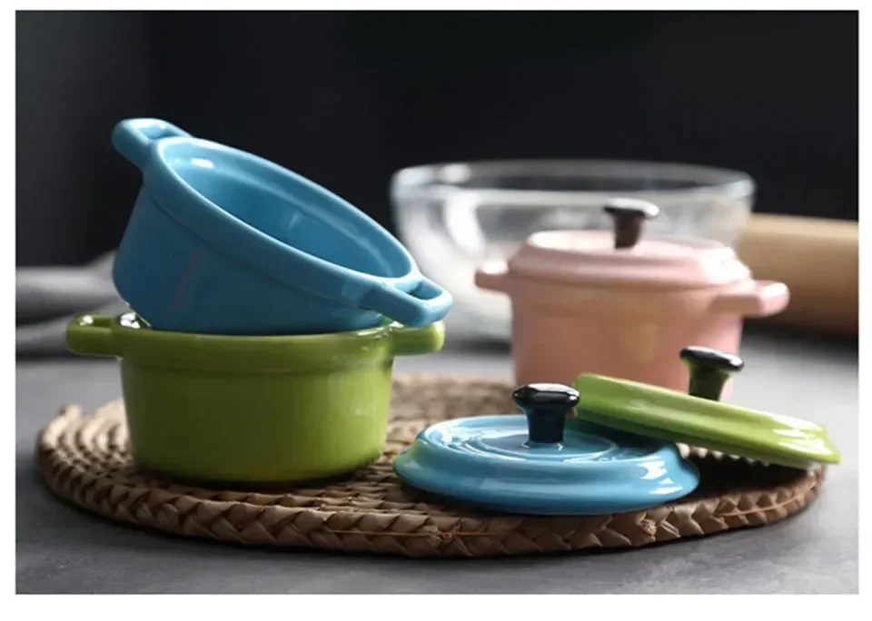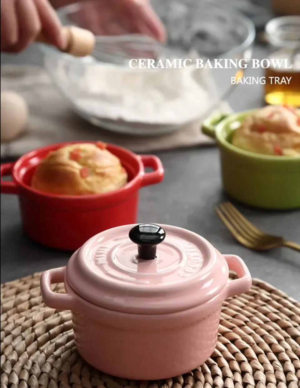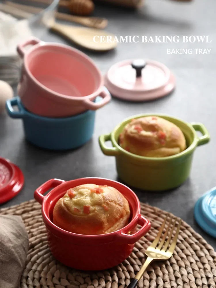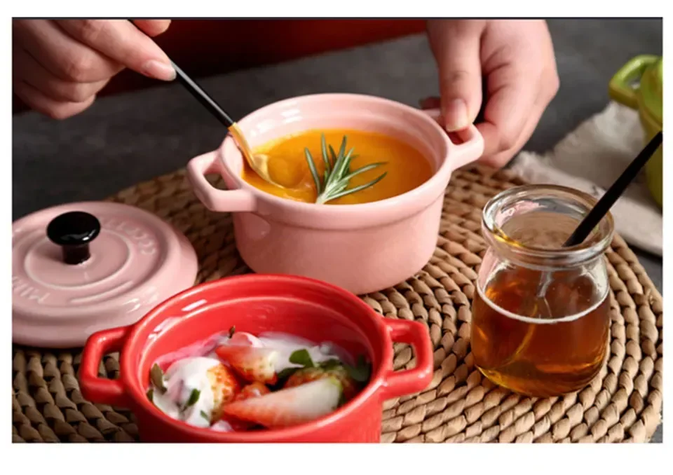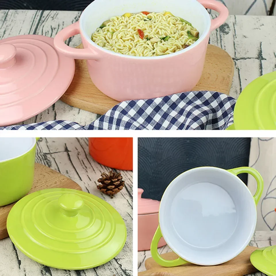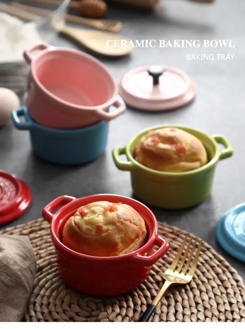 Kitchen Ceramic Bowls Soup Pot Double Ears Baking Bowl with Lid Microwave Oven Dessert Container Mini Casserole Home Cooking Pot