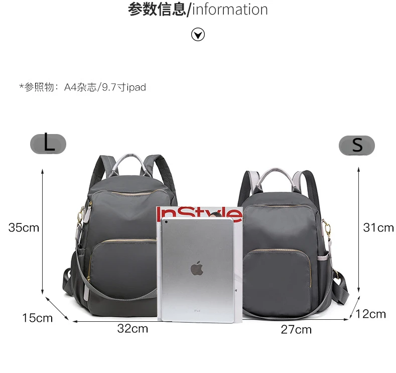 Small Size: 27x12x32cm,Can hold 9.7inch iPad,Fold Umbrella,Phone, Wallet,Key, Power Bank and so on