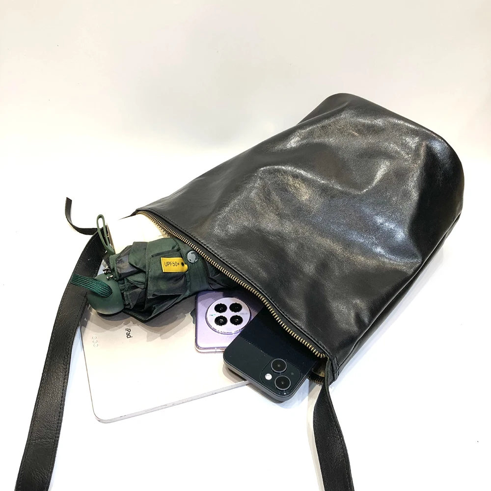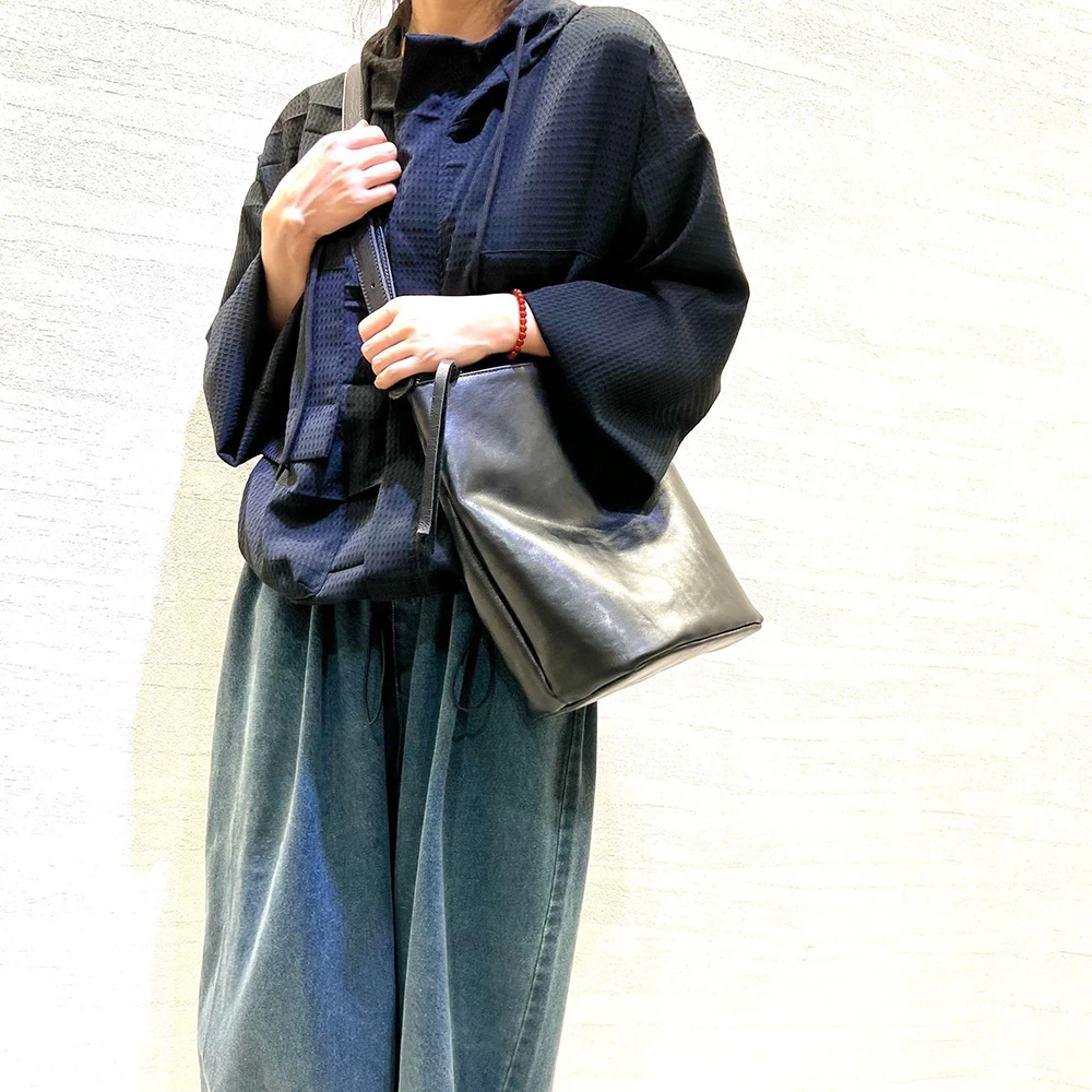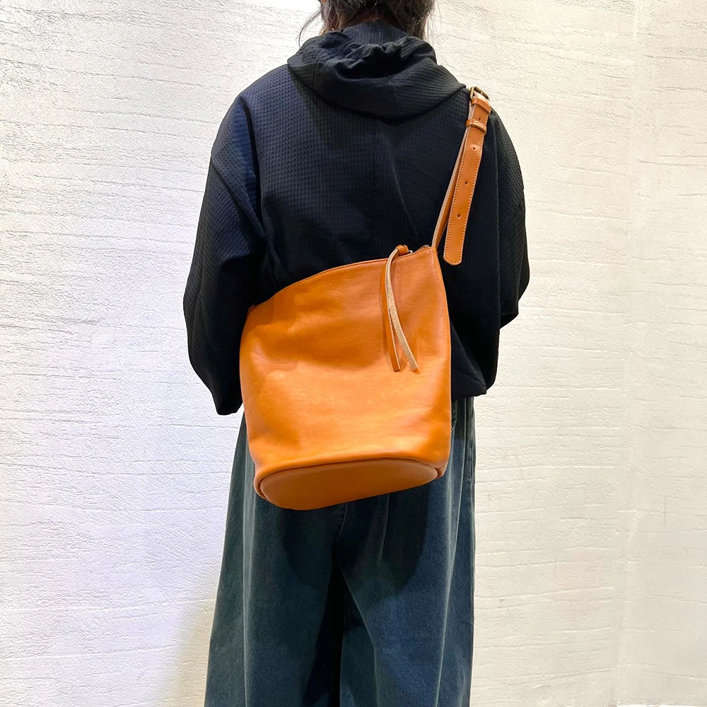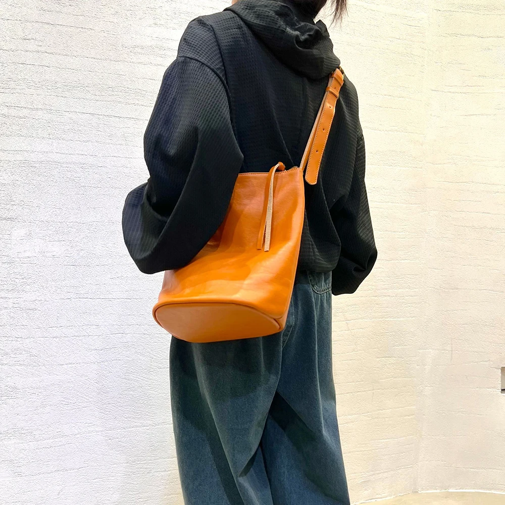 Leisure Genuine Leather Bucket Bag for Women Bucket Tote Long Strap Crossbody Bag Soft Quality Female Versatile Shoulder Bag