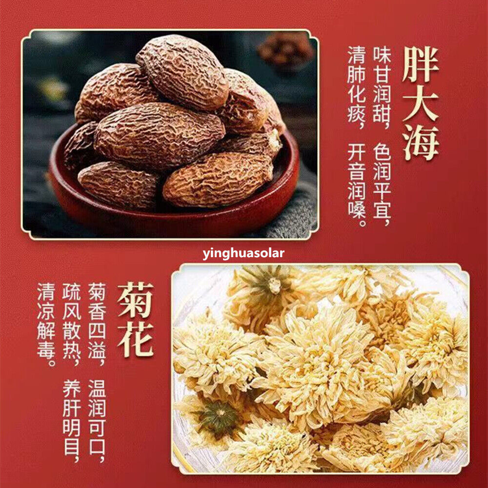 - 配料:胖大海、罗汉果、菊花、决明子、枇杷叶、甘草.