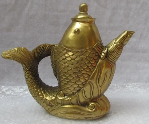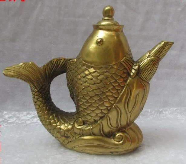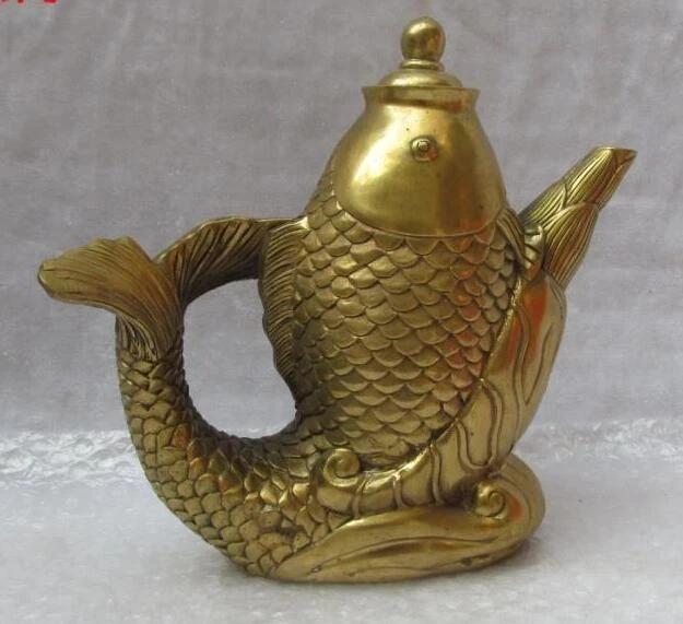 Marked Old China brass fengshui Auspicious Fish statue Wine Pot TeaPot big