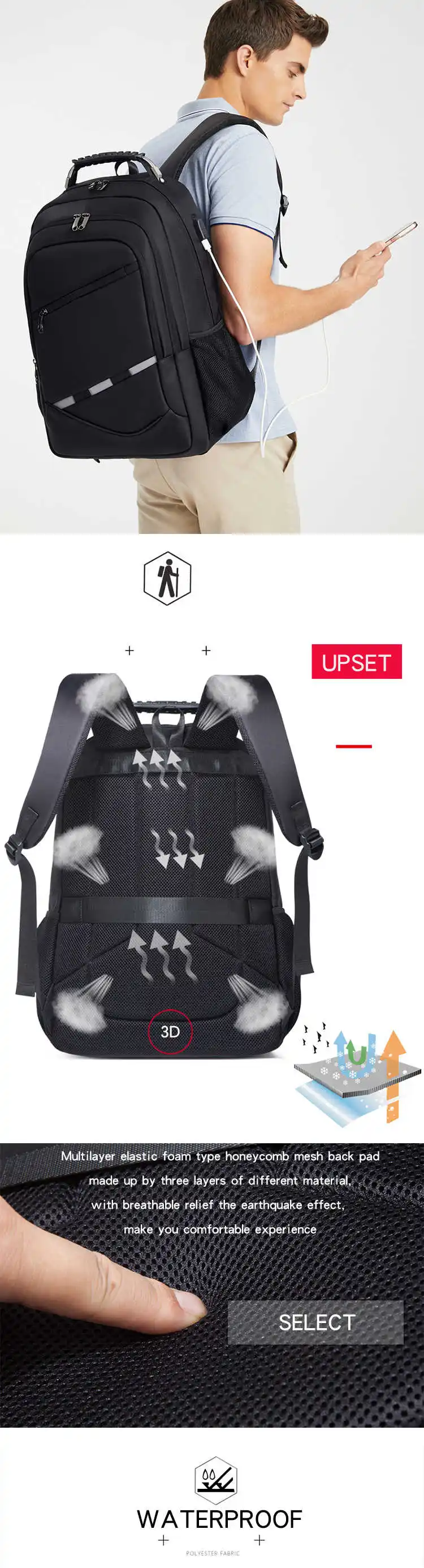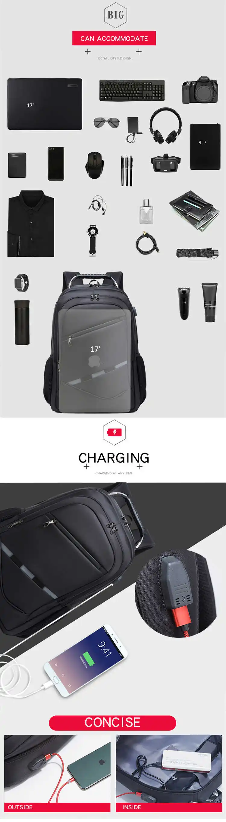 Men's Backpack 17.3 Inch Laptop Business USB Charger Travel Commuter School Bag