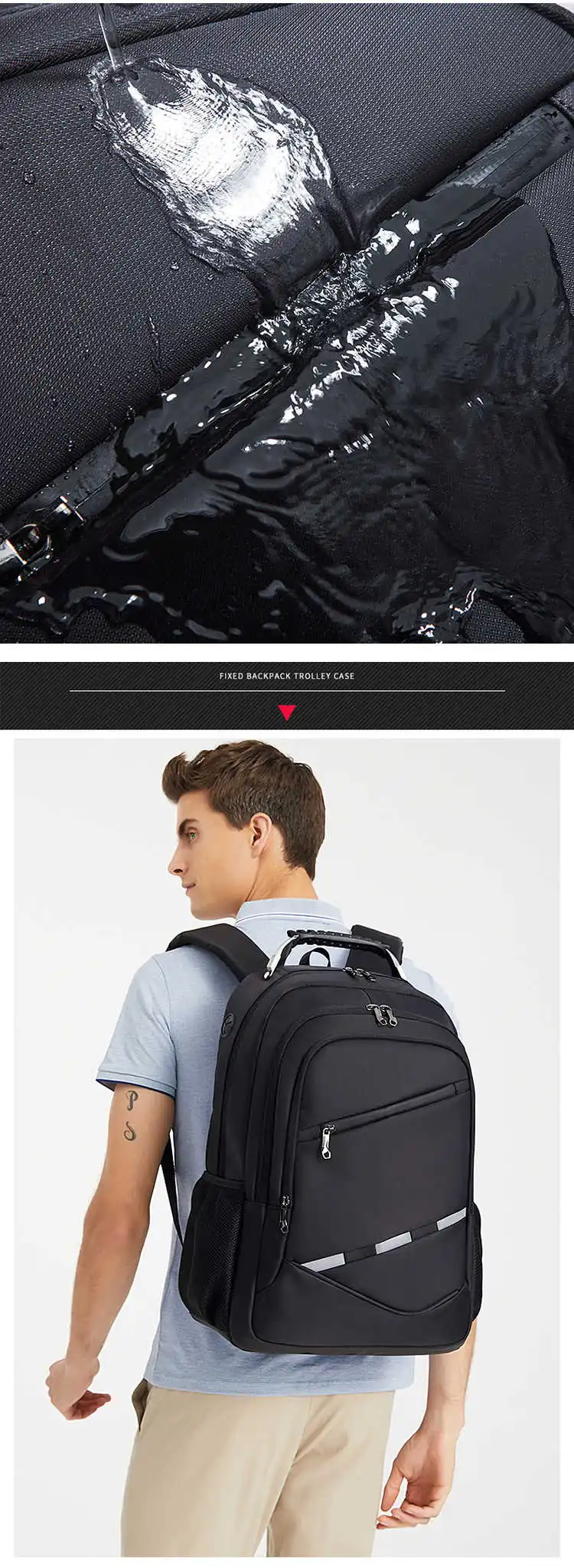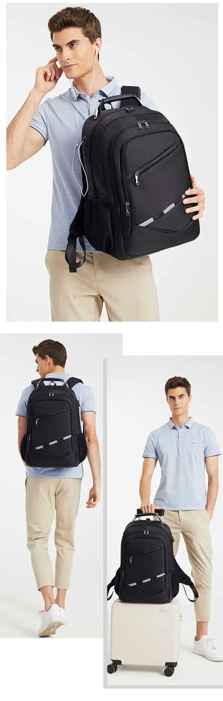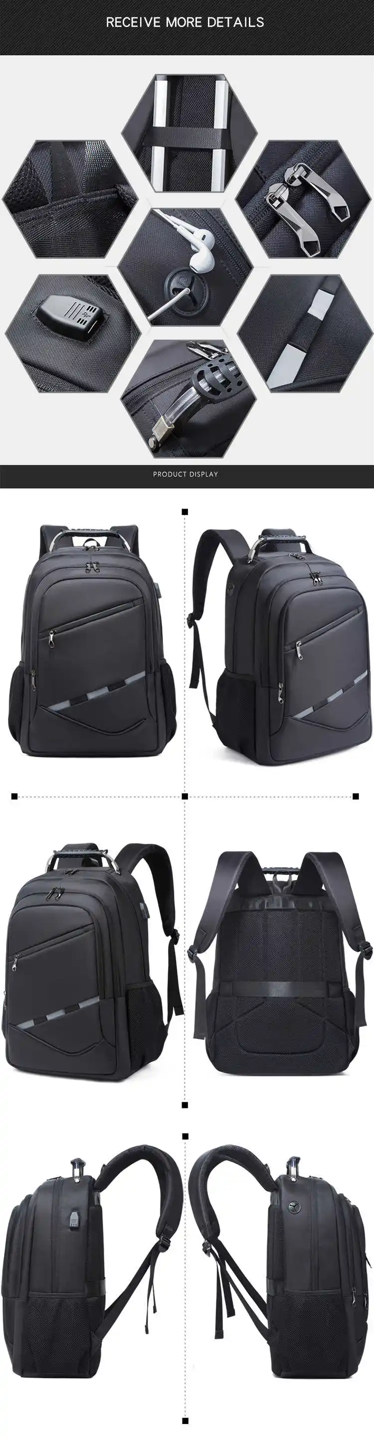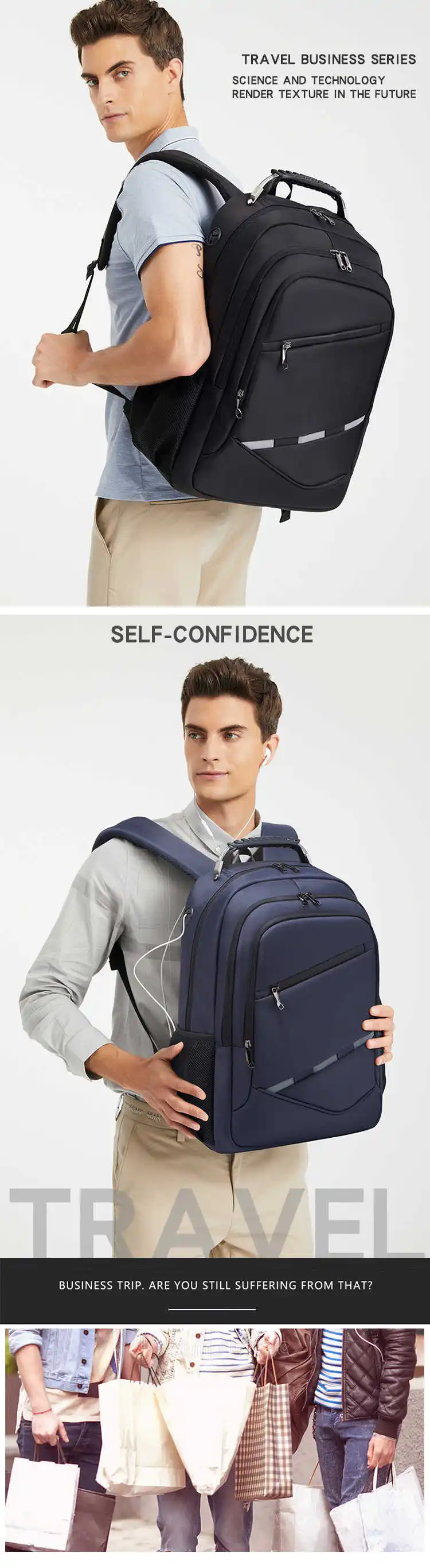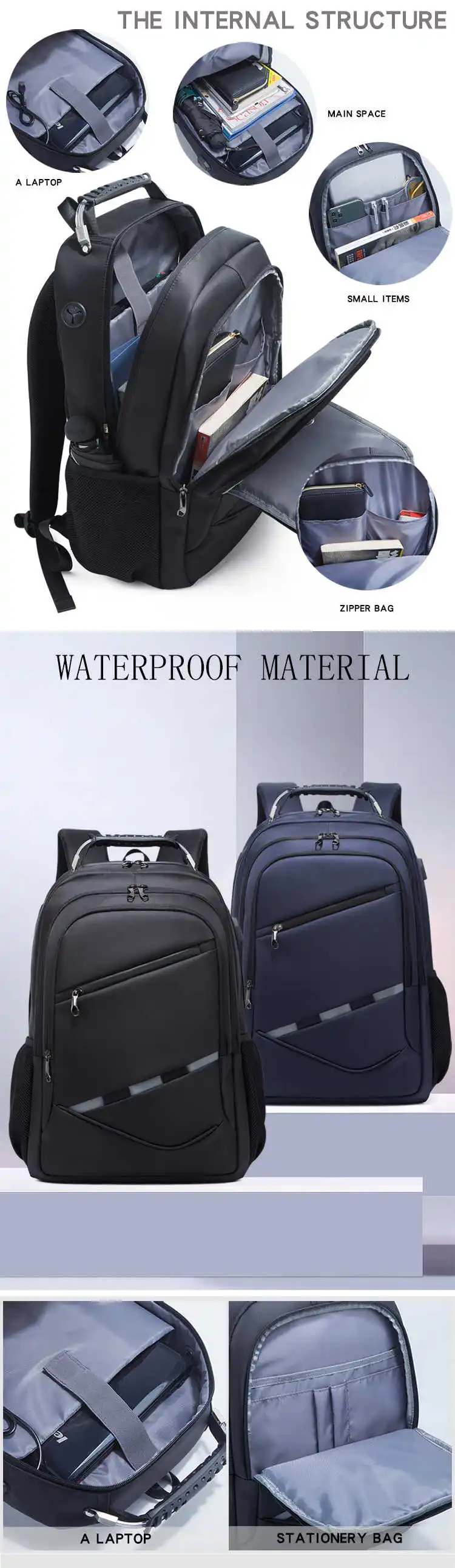 Luggage size: large Capacity: 36-55L Internal structure of the bag: zipper pocket, mobile phone pocket, document pocket, interlayer zipper pocket, computer pocket Opening method: zipper Applicable gender: unisex / both men and women Material: Oxford cloth With lock or not: no With or without rain cover: no Function: breathable, waterproof, wear-resistant, anti-theft pattern: plain Style: business commuter Lining texture: polyester Types of accessories: Backpack shoulder pads Strap root number: double root Carrying parts: soft handle Outer bag type: inner patch pocket Bag shapes: square vertical section With or without tie rod: No Carrying System: Physiological Curve Backplane Color: blue, black Is there a back cushioning cotton: yes Waterproof degree: water repellent Computer size: 17.3 inch computer Business Backpack: Large Capacity Backpack Gift Backpack: Computer Backpack