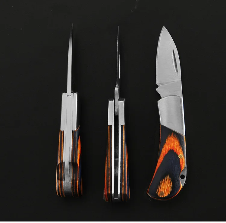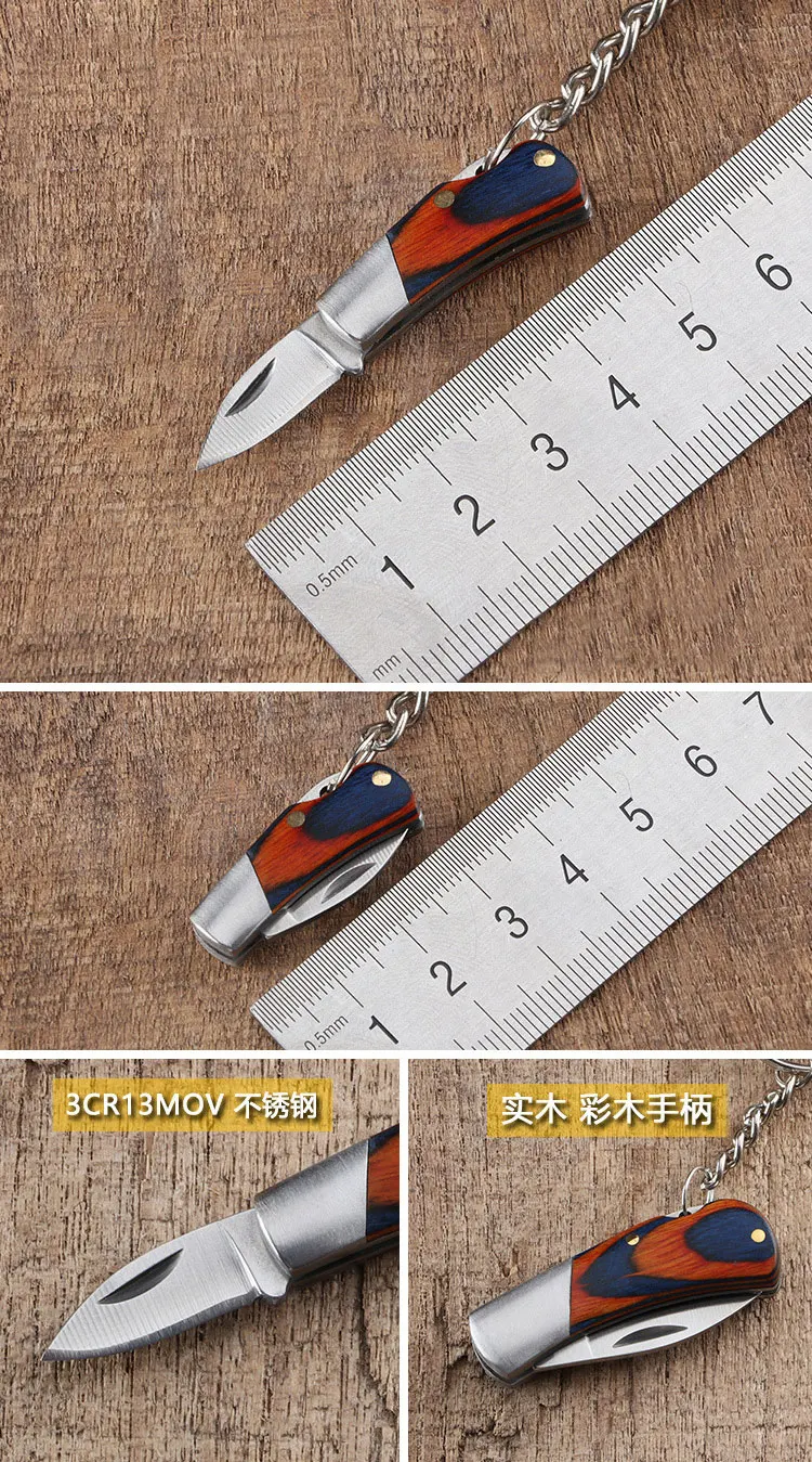 Full Size: 50mm Blade length size: 17mm Blade material: 3CR13MOV Handle material: color wood Blade thickness: 1mm Cutting edge hardness: 55HRC Weight: 11g Scope of application: survival in the jungle, camping in the wild, self-driving travel, gift giving