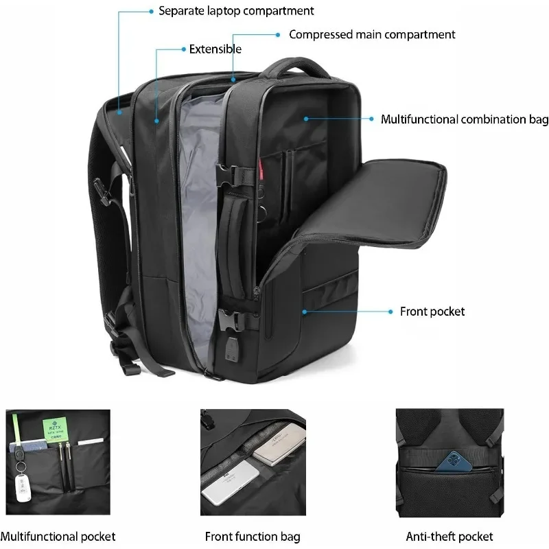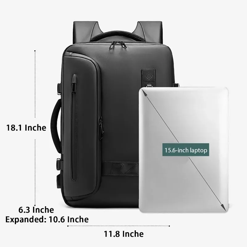 Expandable Backpack: Before expansion - 11.8*6.3*18.1 inches(L*W*H); After expansion - 11.8*10.6*18.1 inches(L*W*H). Capacity up to 40L after expansion, Increase capacity, improve comfort and relieve back pressure. The 180 degree zipper seal helps you get through security quickly.