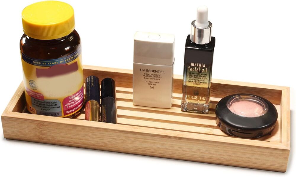 - VERSATILE BATHROOM STORAGE – This Bamboo vanity tray is perfect for storing Creams, Medicine, Lotions, Tooth Paste, Jewelry, Candles and many other toiletries.
