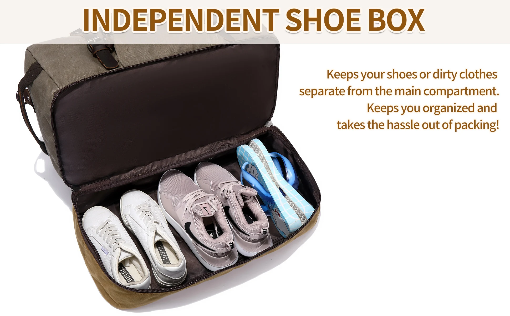 Separate Shoes Compartment: can hold your shoes or dirty clothes for easy separation from clean clothes, the main compartment is roomy enough for a few changes of clothes. Back side sleeve allows you to fit it in trolley case to free your hands