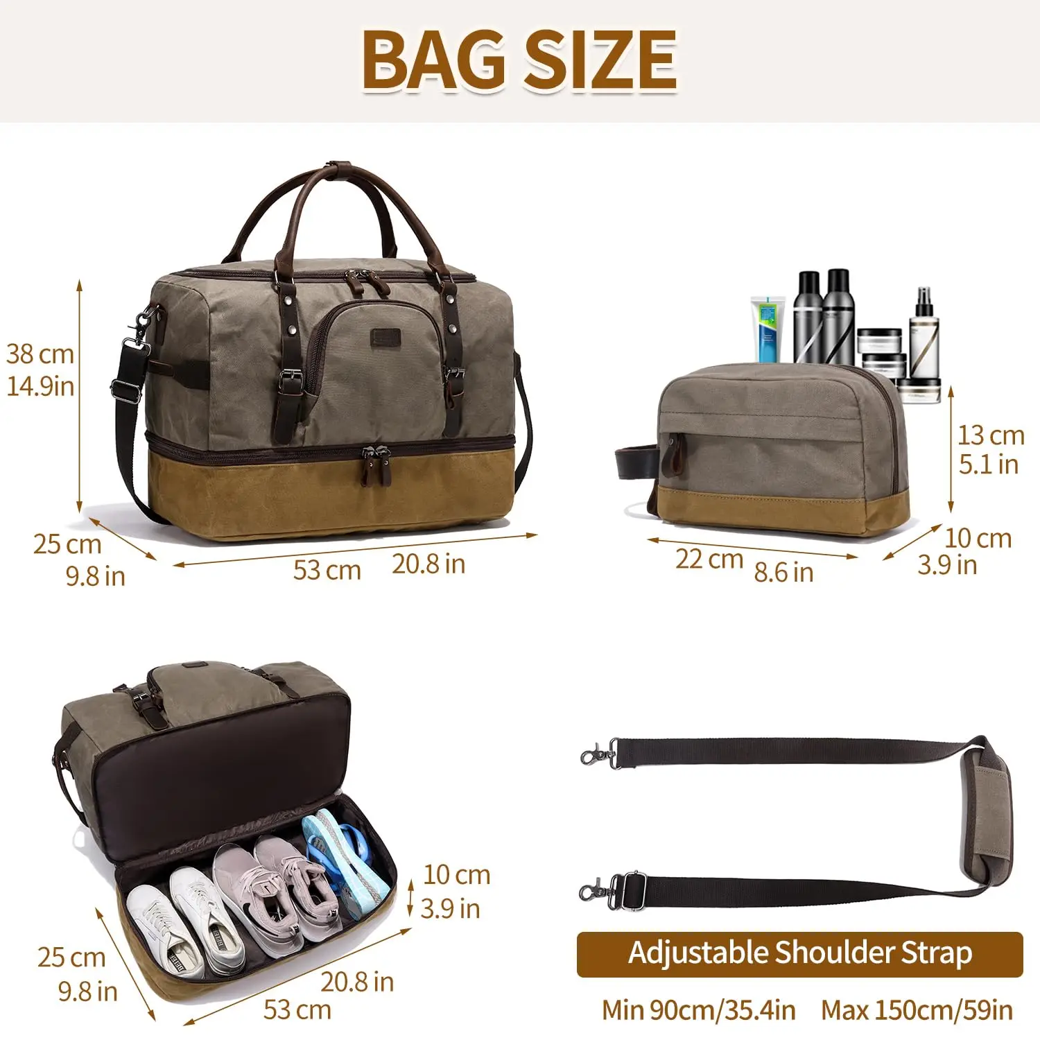 Dimension: Large weekender overnight bag: 21 "L * 10 "W * 15 "H(weigh 3.3lb). Toiletry Bag: 8.6 "L * 4 "W * 5"H(weights 0.4lb)