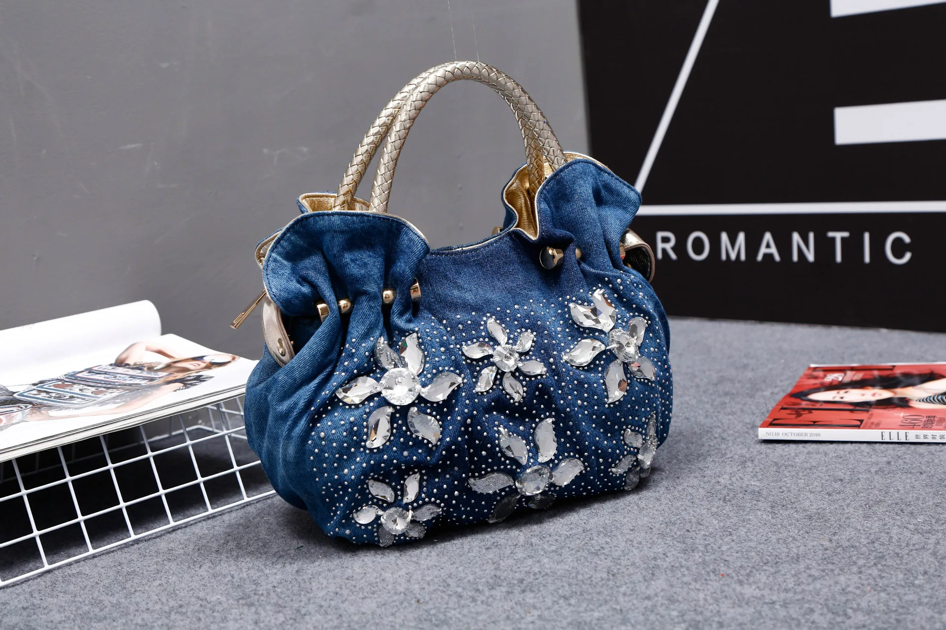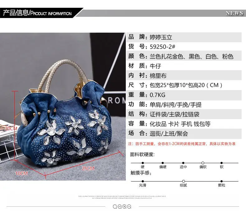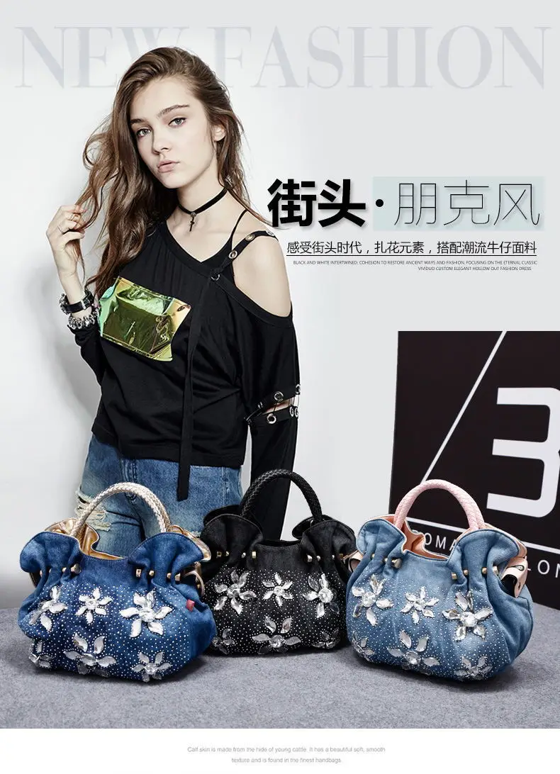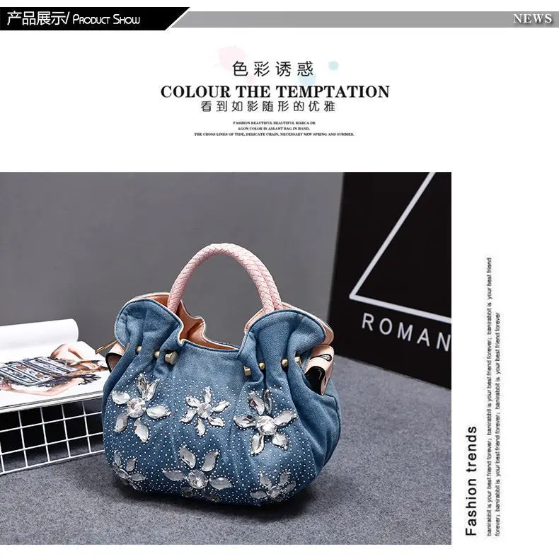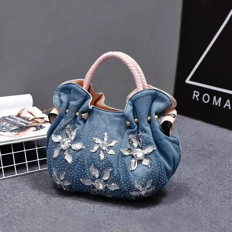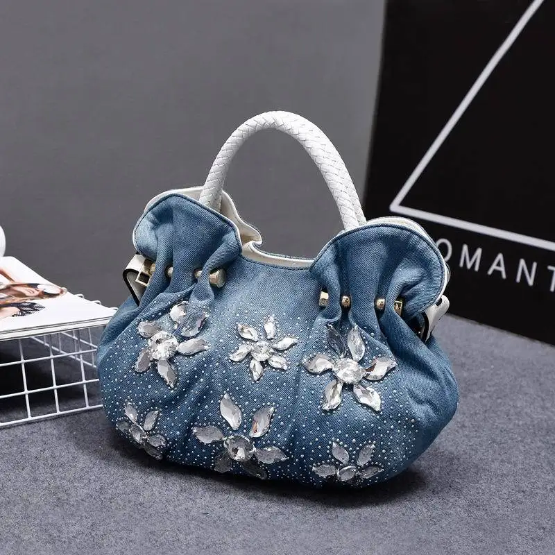 New Women Denim Bags Sweet Blue Pattern High Quality Handbags With Purses Diamond Ladies Tote Bag Messenger Bags