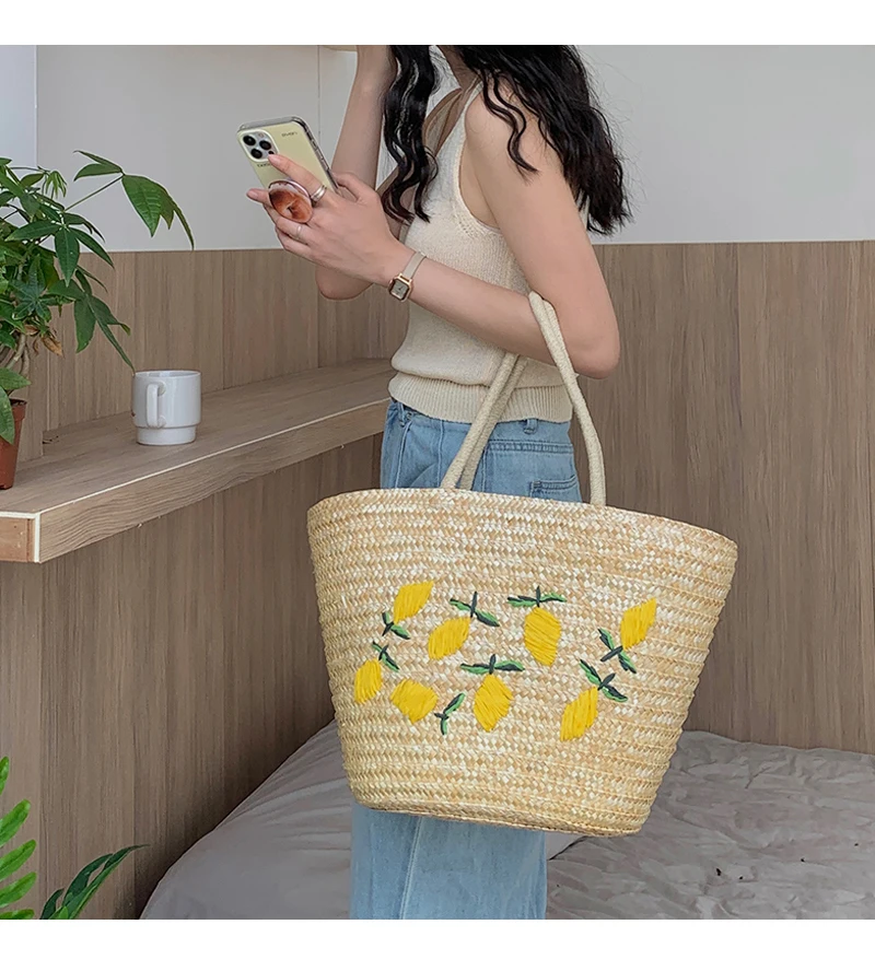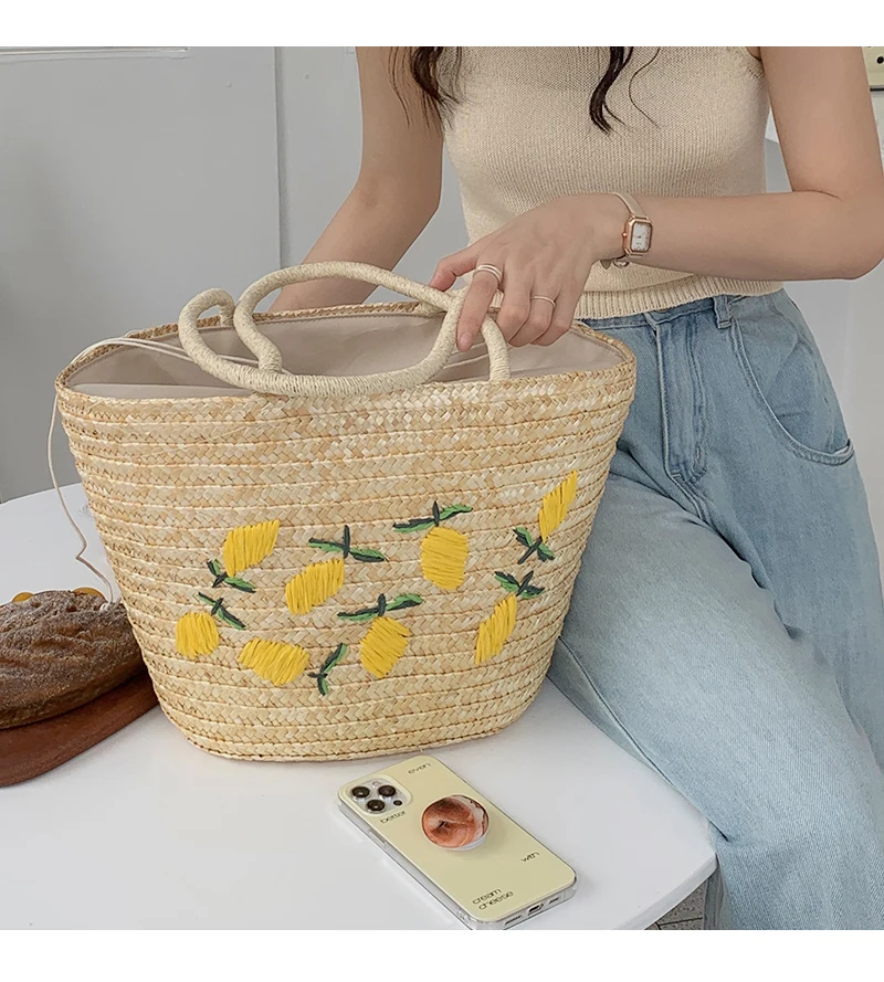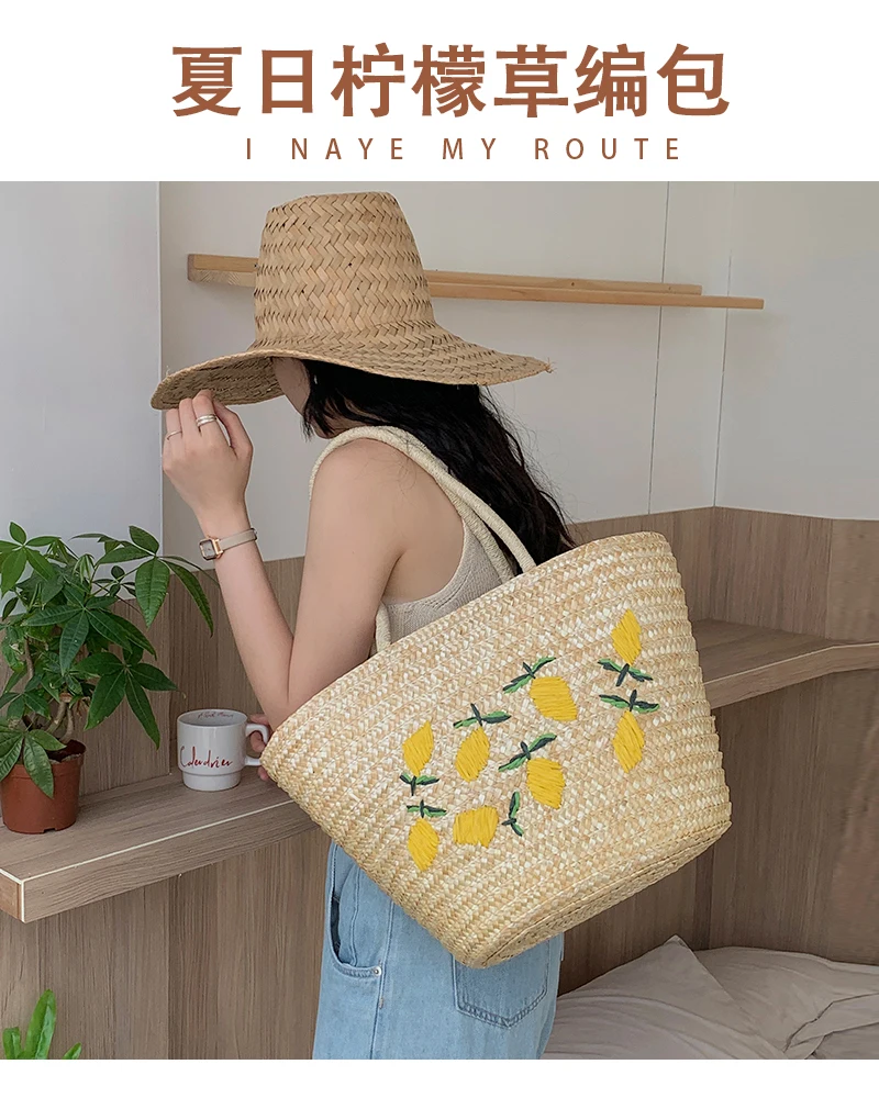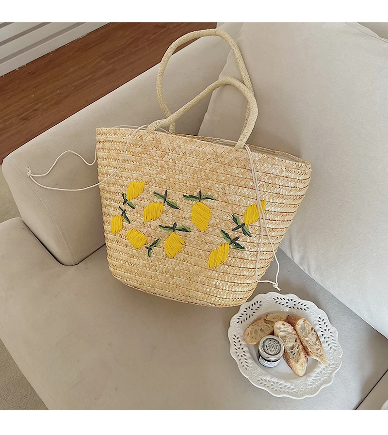 New Straw Woven Bag Lemon Fruit Embroidery Handwoven Bag Women's Versatile One Shoulder Portable Beach Resort Bag