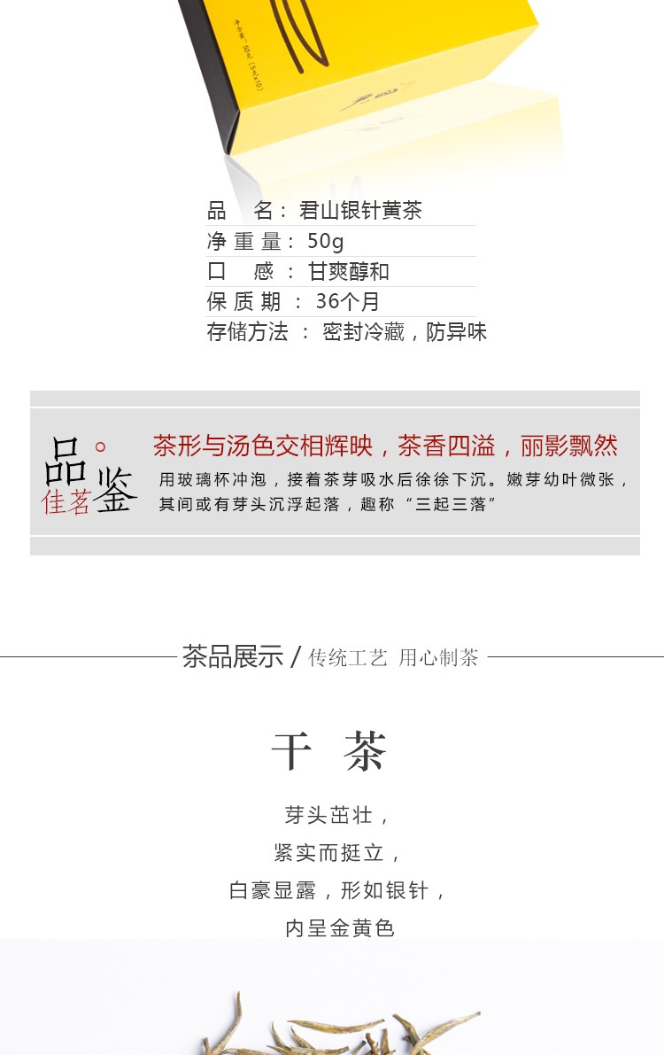 This tea has a sweet, earthy fragrance and sweet, mellow taste. The yellow-silver color and needle-shaped leaf give this tea its name. It is known as the "floating forest of needles"--when brewed, the tea stands up like floating needles. Folks from Hunan like to show off this tea by brewing it in tall glasses to best display its special characteristics.