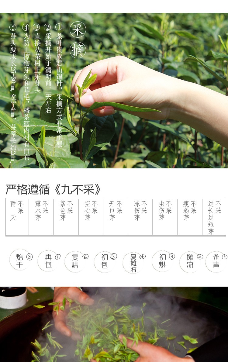 Jun Shan Yin Zhen means Silver Needles of Jun Shan suggesting its color, size, and place of origin. This tea is perhaps best known in this century as the favorite tea of Chairman Mao. Its small, perfectly formed buds are grown near Dongting Lake in Hunan province where only five of the original Yinzhen-producing trees remain. Jun Shan Silver Needle is a rare Chinese yellow tea produced in the Mount Jun area in Hunan province. It was revered enough to be presented to emperors as a tribute. Only the buds are used to make this tea: they are picked according to The Nine "Don't Pick" rules established around 1100 AD.
