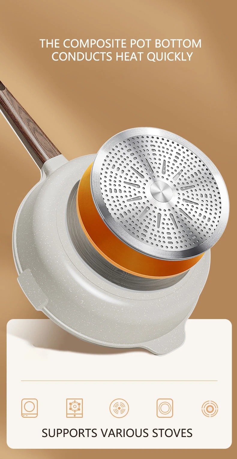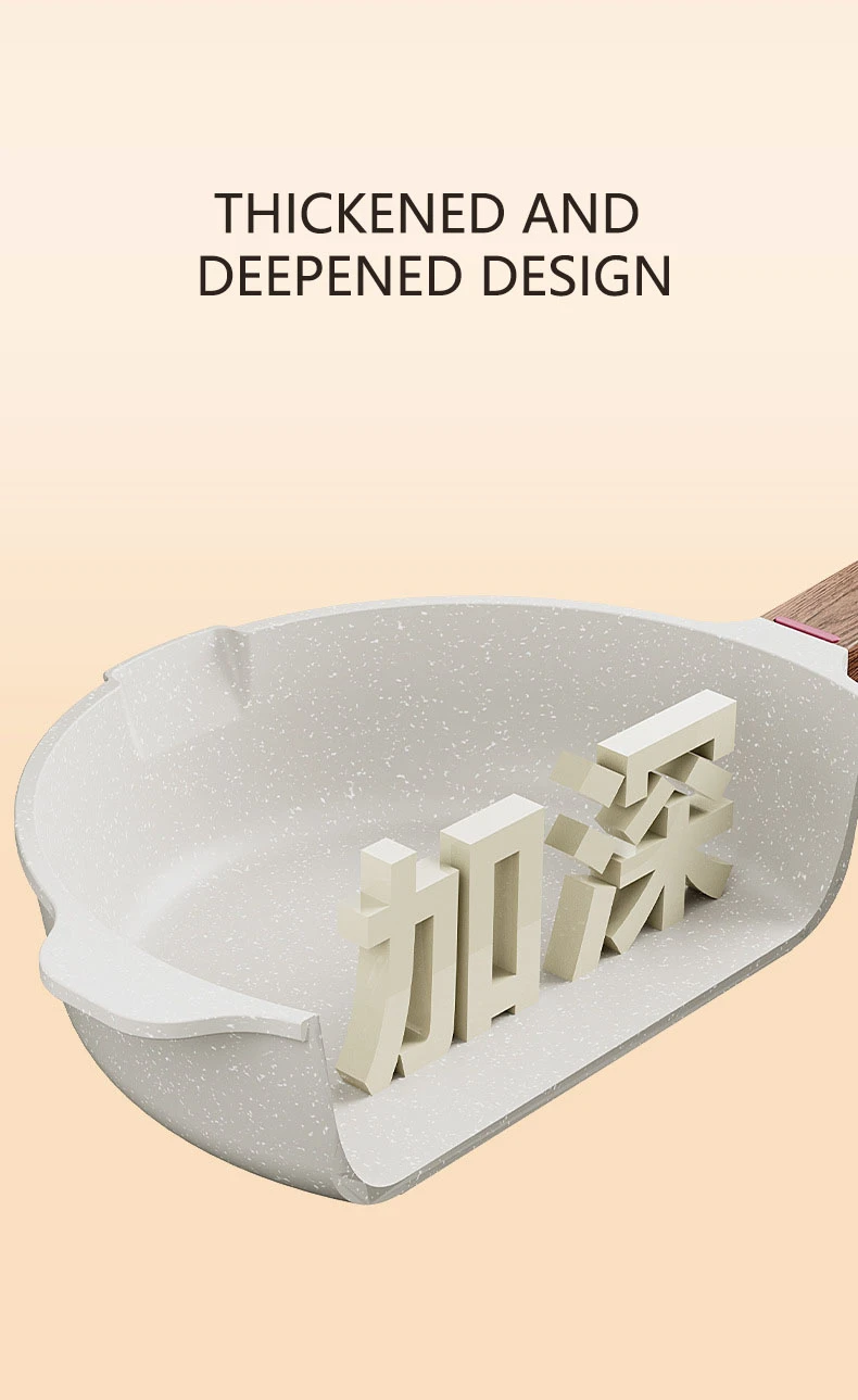 It is made of wrought iron and coated with natural medical stone. The non-stick pans currently on the market are coated. The main reason is whether the material is safe. The non-stick coating is a natural medical stone and is made of high-quality and safe non-stick The layer, does not contain FPA, is non-toxic and harmless to the human body, and can be used with confidence, and the non-stick pan has no oil fume, heat conduction, easy to clean, fuel-efficient, and light. This is the characteristic of our cookware.