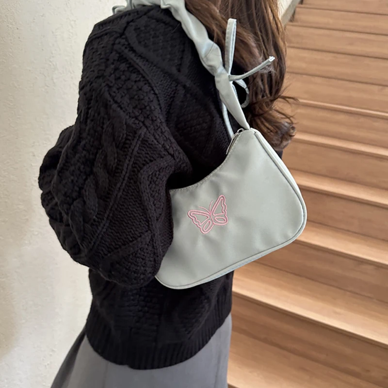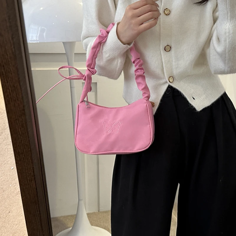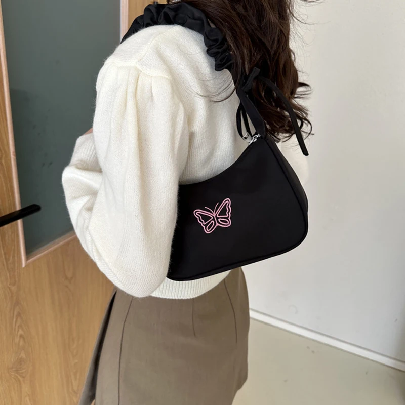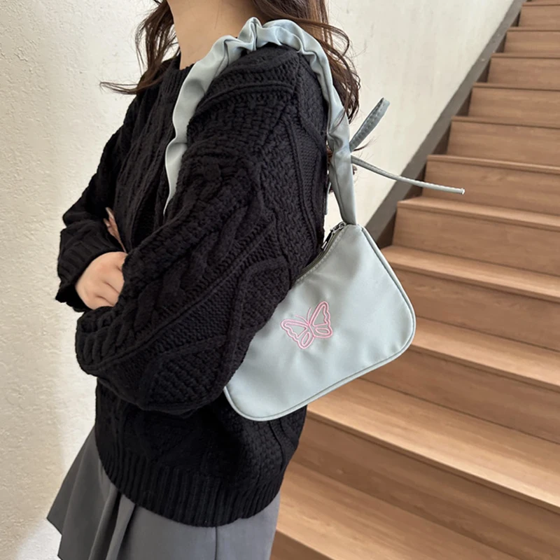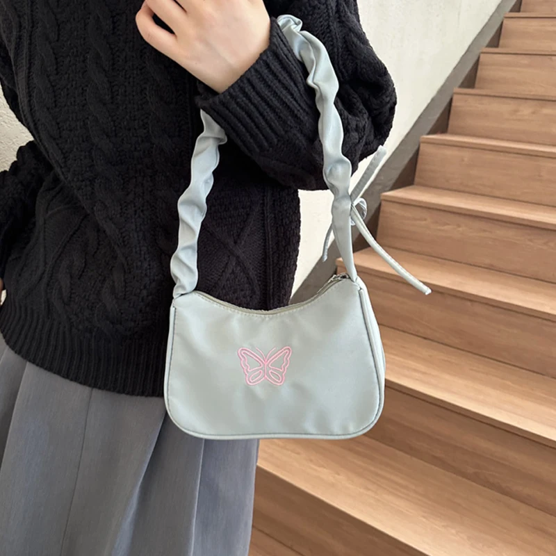 Accessorize in style with this elegant shoulder bag, featuring a charming bowknot with butterfly embroidery that's sure to turn heads. The bag's Y2k style influences are evident in its delightful ruffle handle and overall design, making it a nostalgic nod to a fashionable past. Crafted from resilient nylon, it can carry your daily essentials, including makeup and lipstick, without sacrificing style. Practical and pretty, this handbag is a perfect match for those who love to stand out with their accessories.