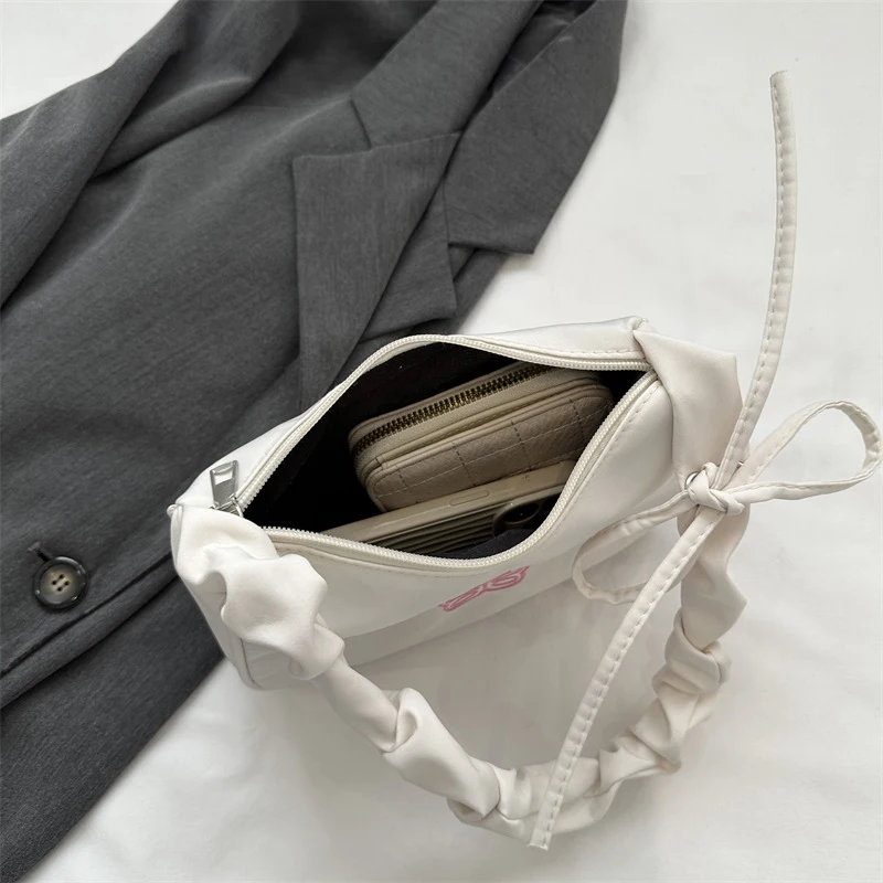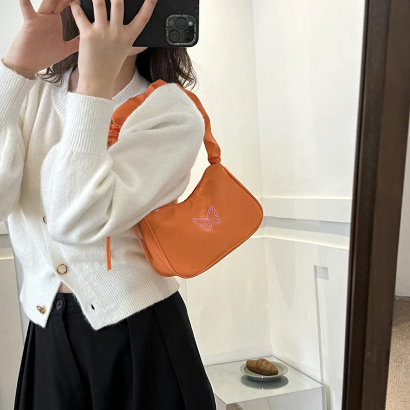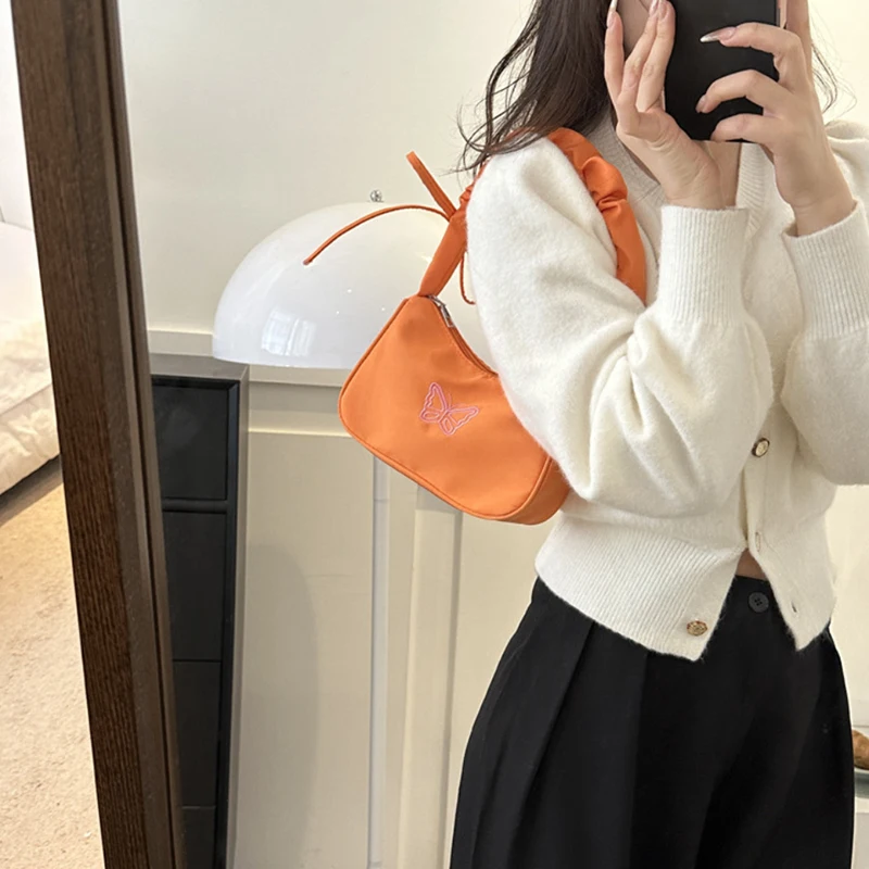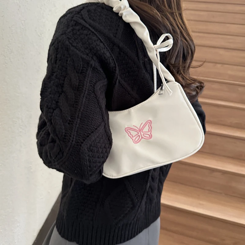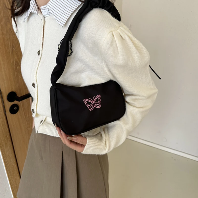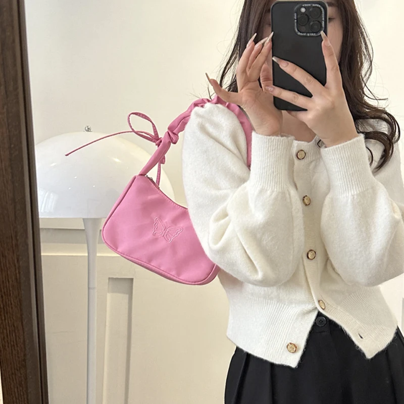 Accessorize in style with this elegant shoulder bag, featuring a charming bowknot with butterfly embroidery that's sure to turn heads. The bag's Y2k style influences are evident in its delightful ruffle handle and overall design, making it a nostalgic nod to a fashionable past. Crafted from resilient nylon, it can carry your daily essentials, including makeup and lipstick, without sacrificing style. Practical and pretty, this handbag is a perfect match for those who love to stand out with their accessories.