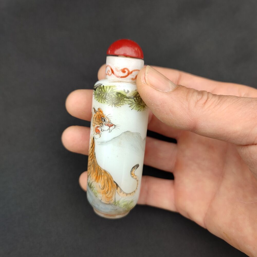 Old Beijing chinese colored glaze Painted tiger Glass Snuff Bottle box painting